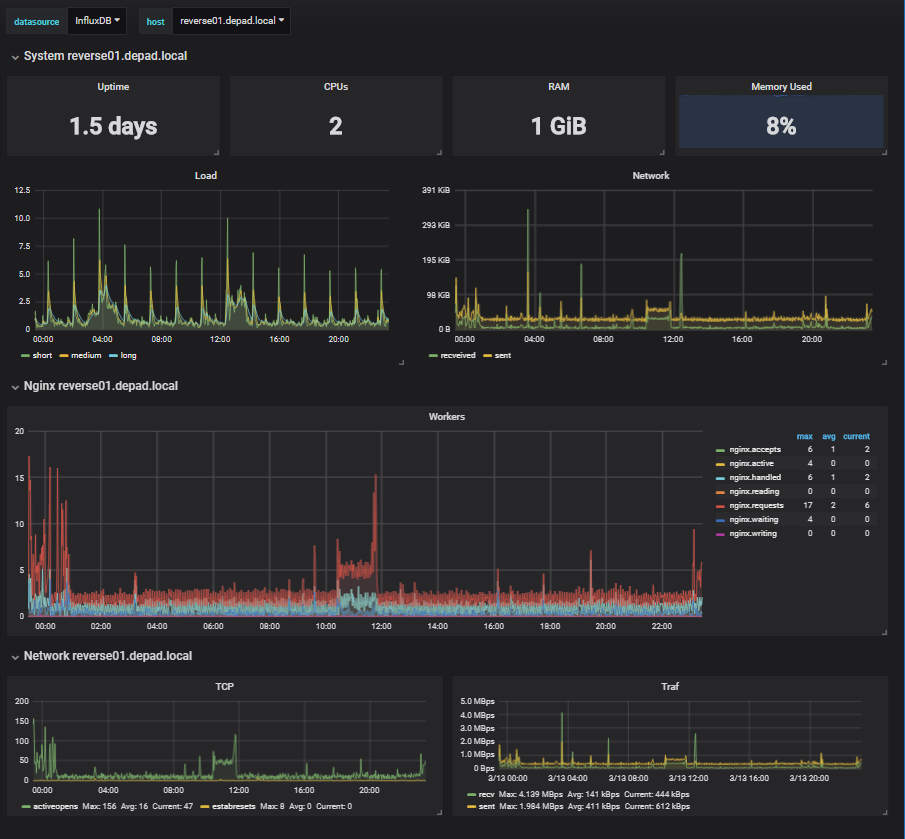 The Nginx dashboard uses the influxdb data source to create a Grafana dashboard with the graph and singlestat panels.