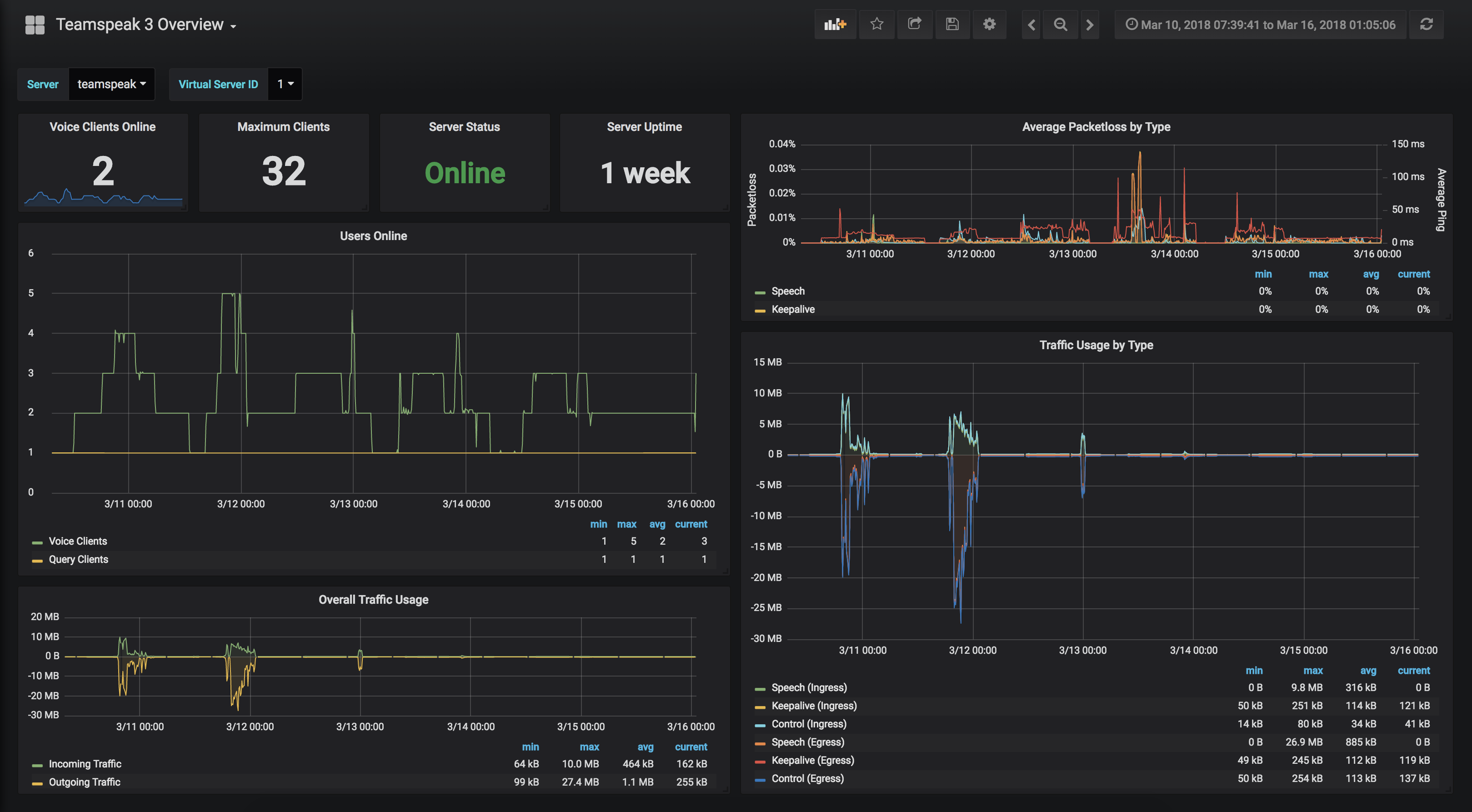 Shoutout to thannaske for heavily inspiring the presentation of this data. Check out his Teamspeak 3 Metrics (InfluxDB) dashboard