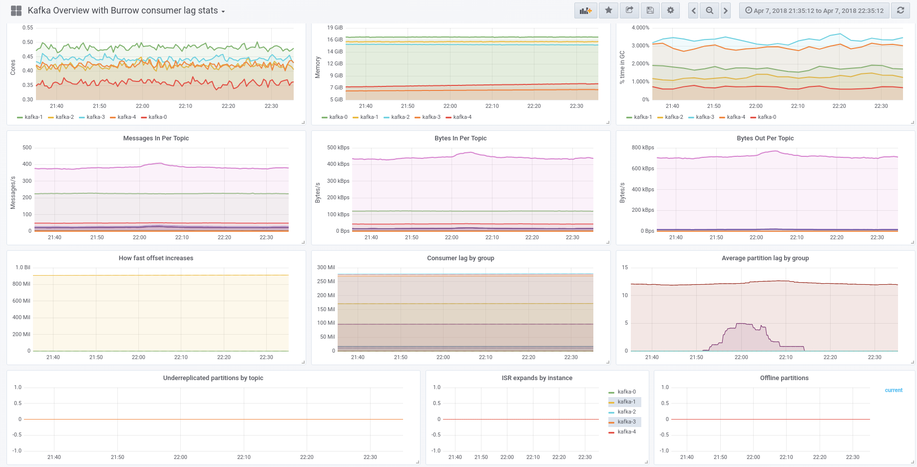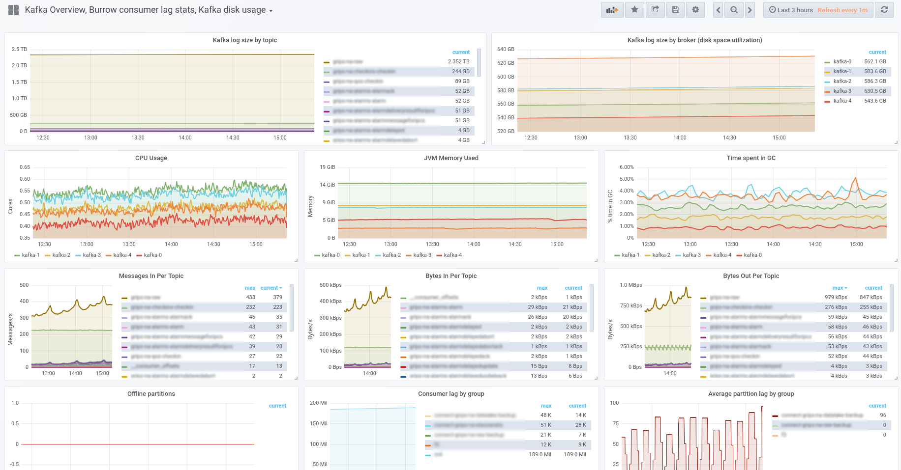 Kubernetes Kafka Overview, Burrow consumer lag stats, Kafka disk usage