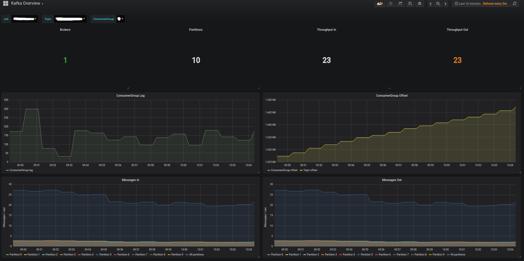 The dashboard for metrics collected by kafka_exporter. The job label must be kafka_exporter.