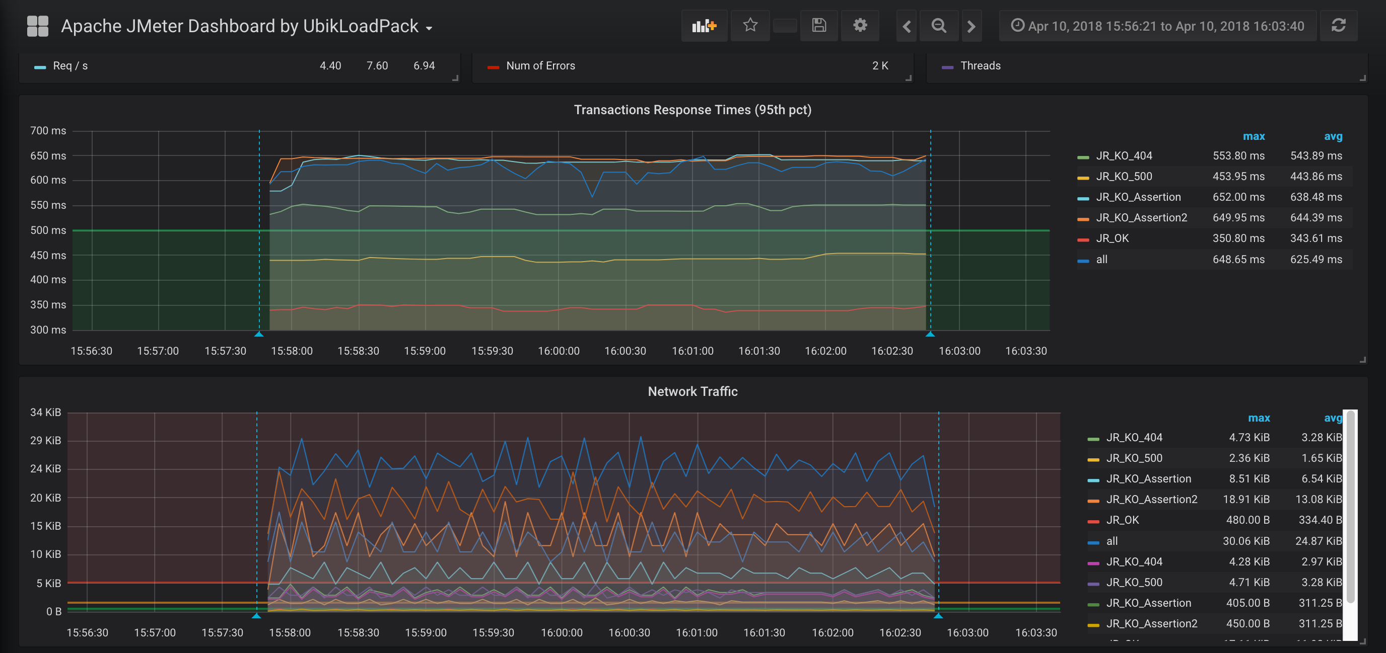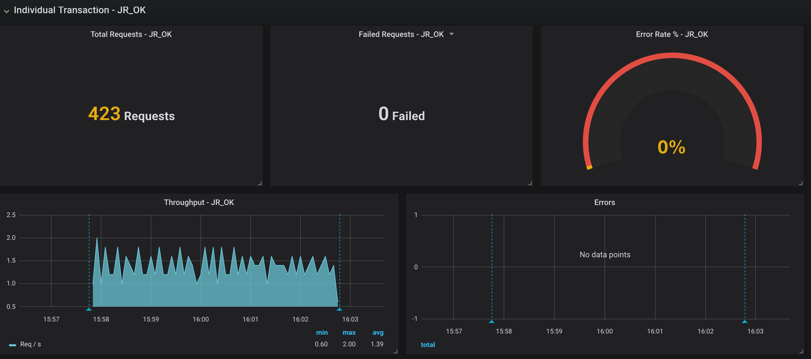 This dashboard requires Apache JMeter 5 and upper versions. It shows overall statistics and you can zoom on one particular transaction. In order to use it you need to use JMeter Backend Listener and select InfluxdbBackendListenerClient.
