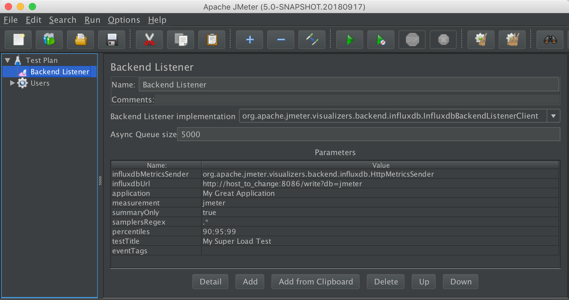 - Add Backend Listener to your test plan (Add -> Listener -> Backend Listener) and select org.apache.jmeter.visualizers.backend.influxdb.HttpMetricsSender
