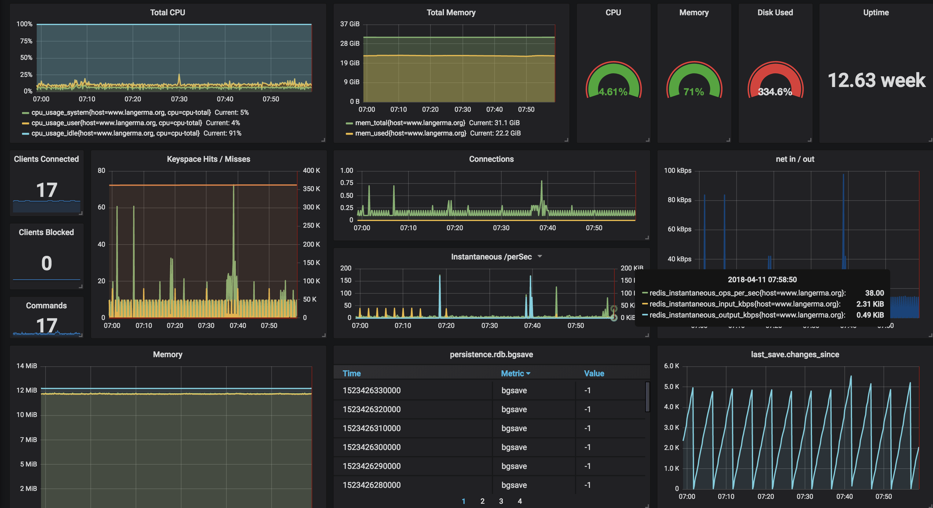 The Redis Server Metrics dashboard uses the opentsdb data source to create a Grafana dashboard with the graph, singlestat and table panels.