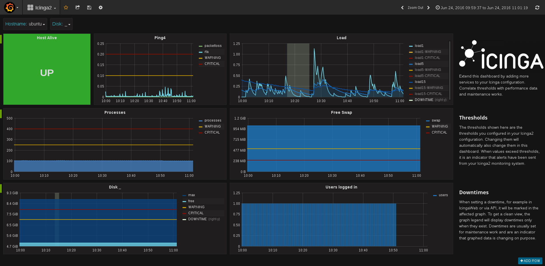 This dashboard can be used with a default icinga2 installation. It will show different states about a host and its services. Including UP/DOWN state, load, disk space, process count and more. The intention of the dashboard is to be extended as your icinga2 configuration grows. It includes special values like thresholds and downtimes.