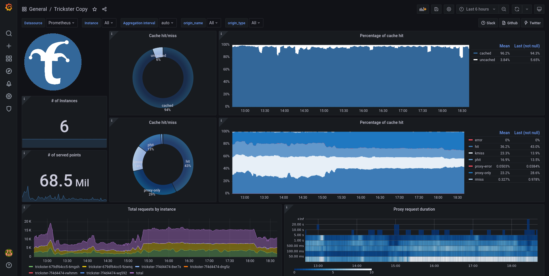 This dashboard should give you good idea about how is Trickster effective in caching, it's utilization and possibility to observe possible impacts on time-series databases behind it (currently only Prometheus).