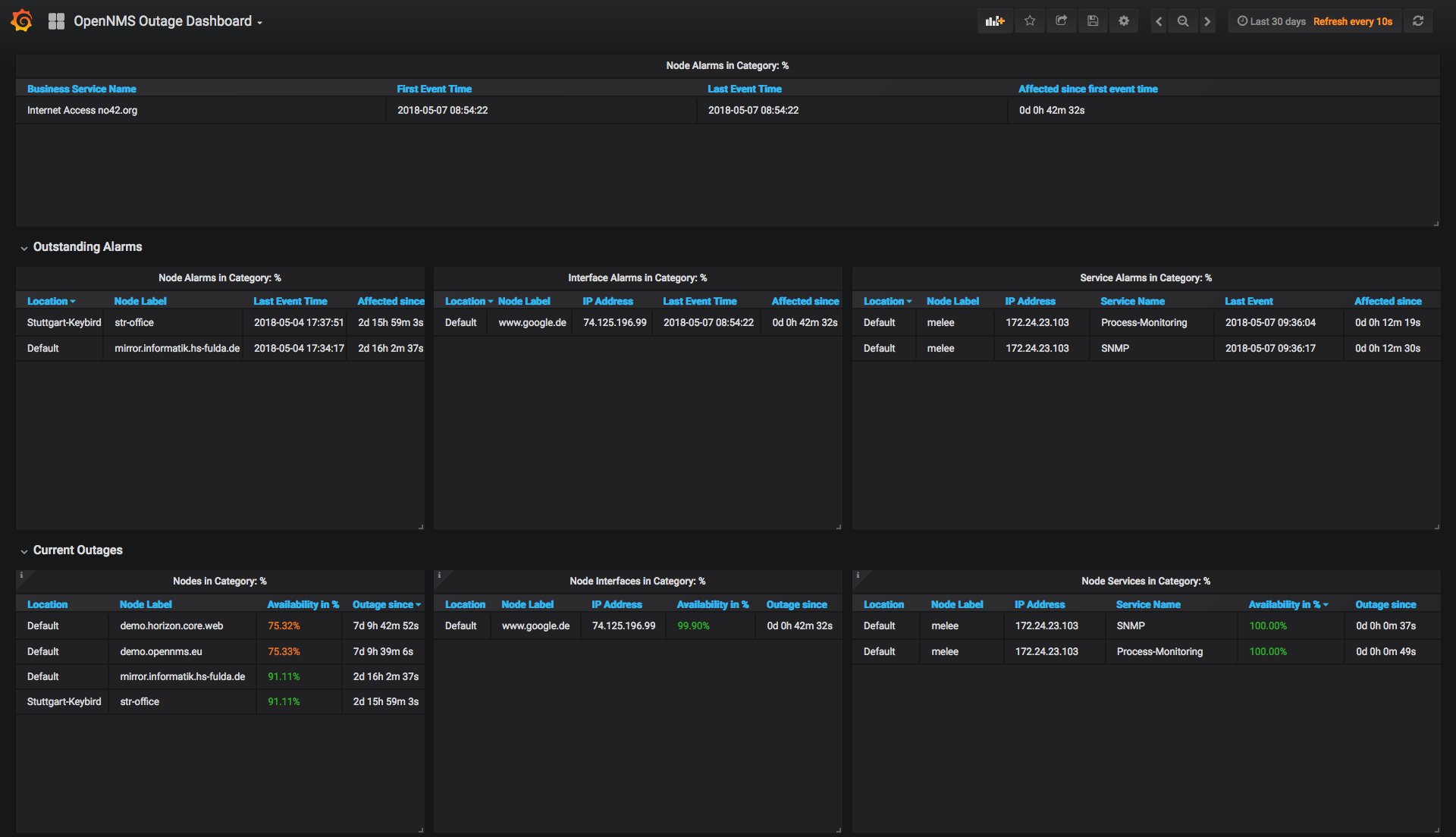 Show availability and alarms from Business Services, Nodes, IP interfaces, and Services. The dashboard requires the Grafana PostgreSQL data source.