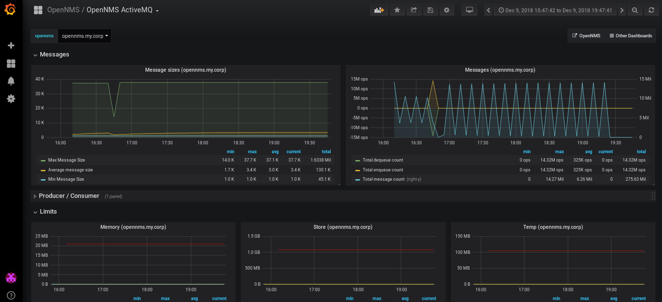 The OpenNMS ActiveMQ dashboard uses the opennms-helm-performance-datasource data source to create a Grafana dashboard with the graph panel.