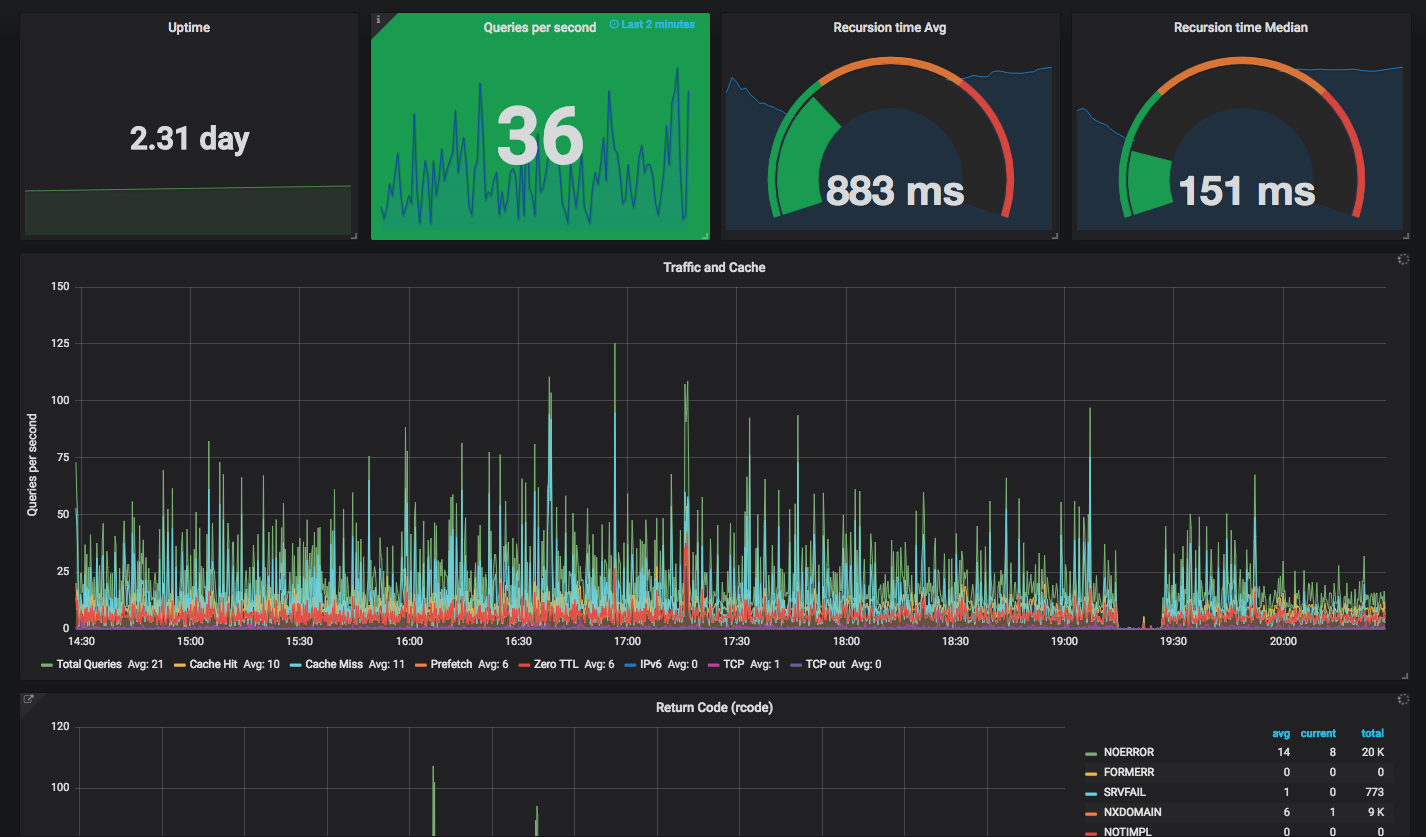 The Unbound dashboard uses the influxdb data source to create a Grafana dashboard with the graph and singlestat panels.