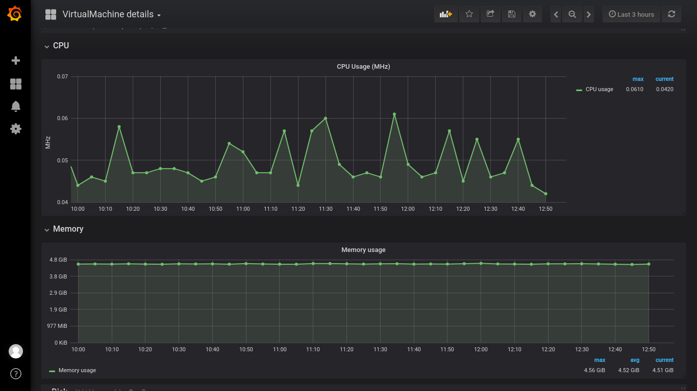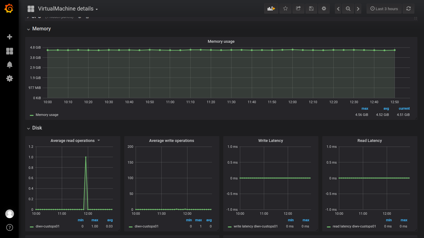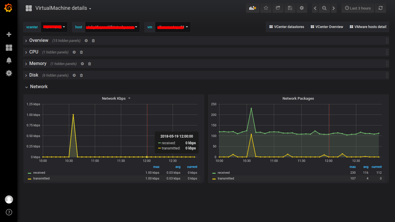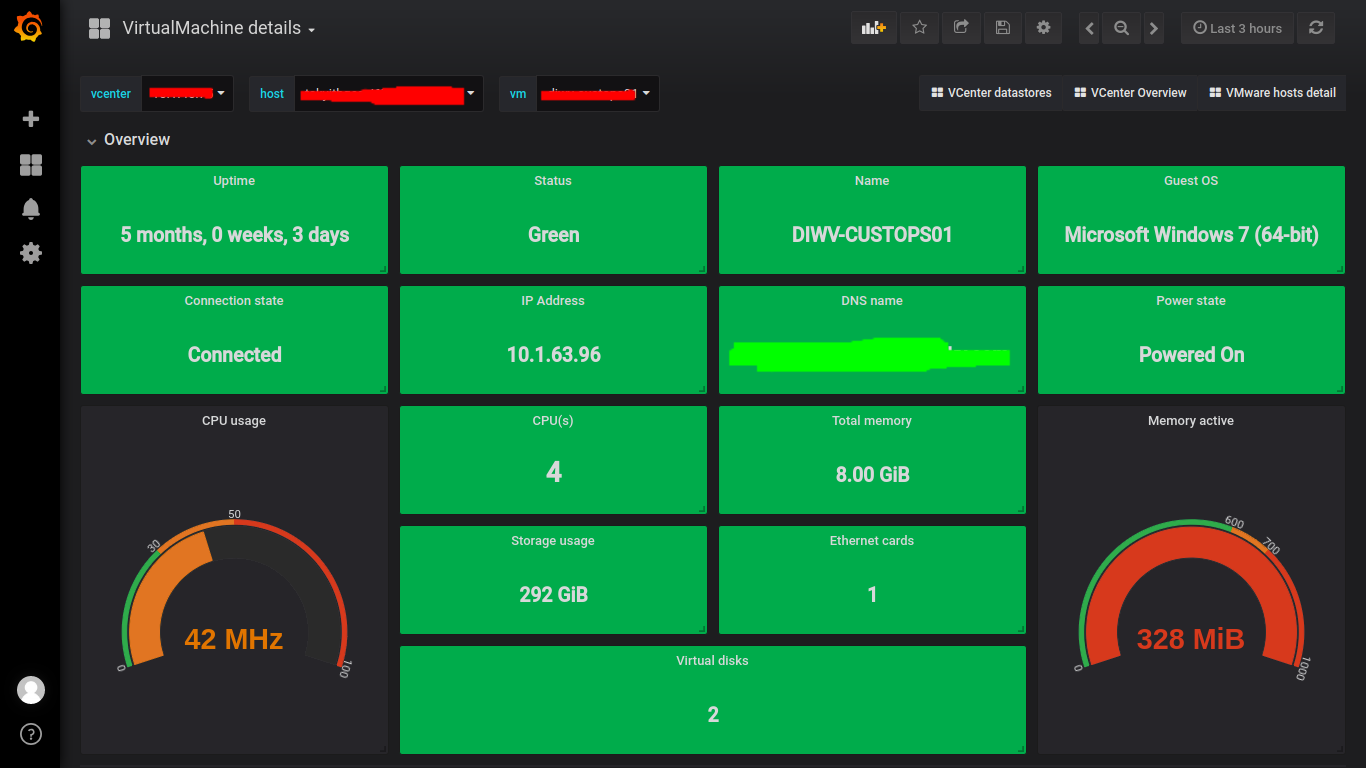 VMware hosts detail Dashboard is the third of the 4 series dashboards for VCenter monitoring. It shows the Overview (uptime,cpu's,memory...), CPU, Memory, Disk, Network statistics for VM. It is built on Grafana 5 release. The collector used was vsphere-vcenter-influx-go (https://github.com/vikramjakhr/vsphere-vcenter-influx-go)