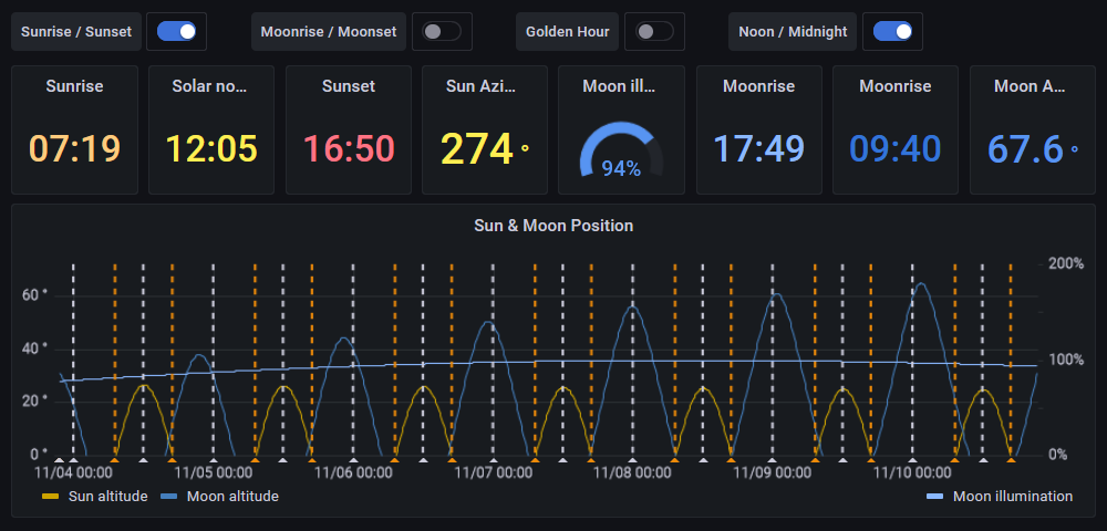This dashboard demonstrates the usage of the Sun and Moon Datasource Plugin.