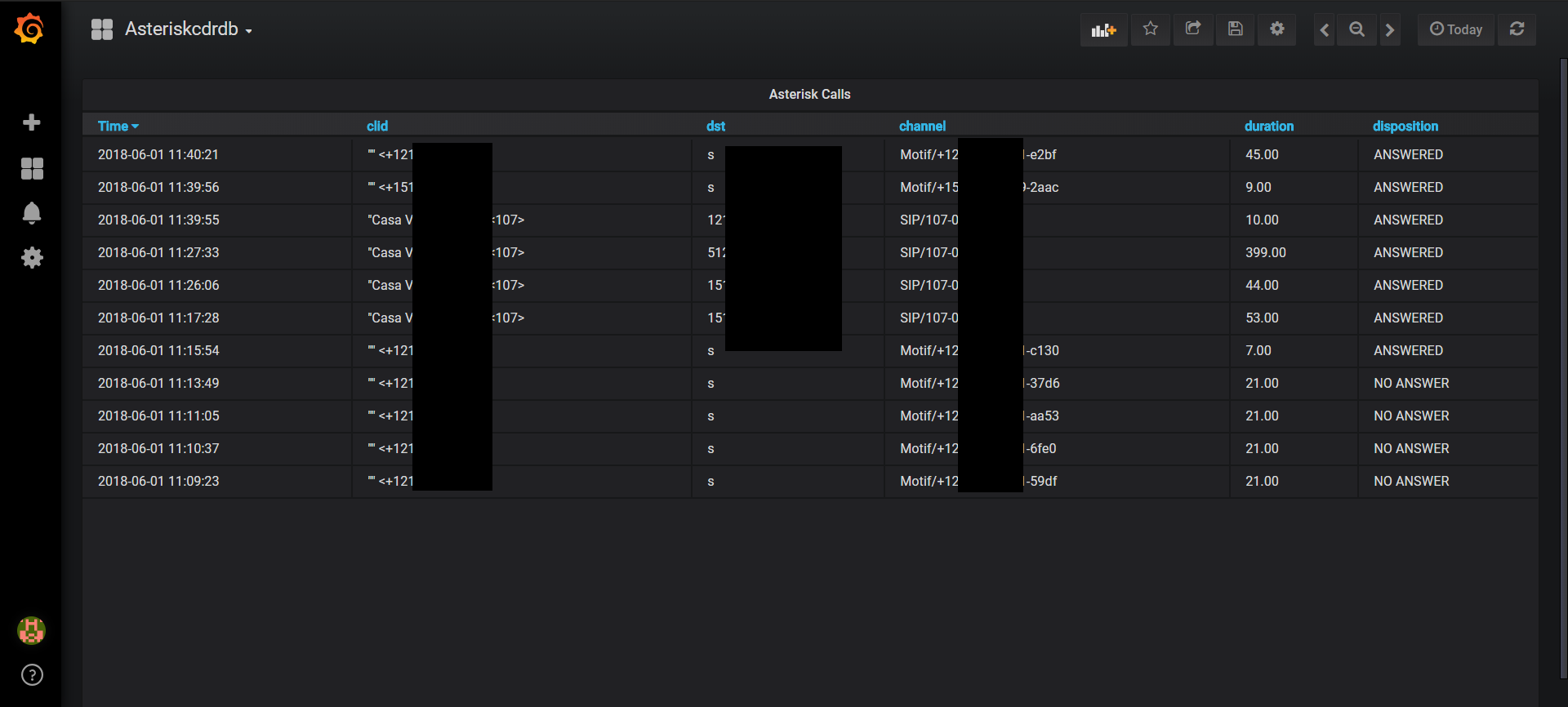 This is my first version of my asterisk CDR Dashboard pulling from mysql asteriskcdrdb table. This just queries the cdr table and uses grafana time range to filter records.