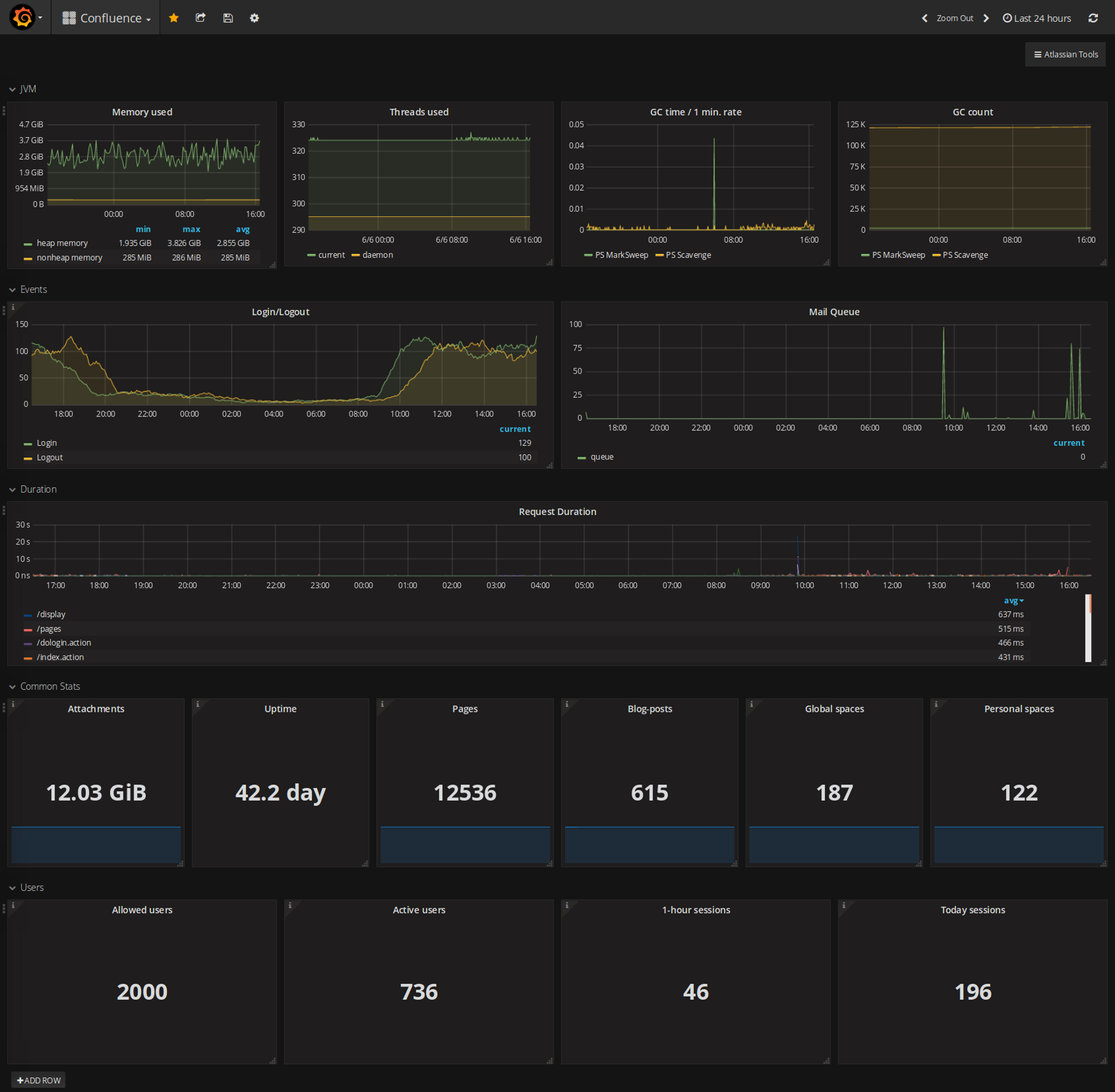 Nearly all values exported by Prometheus Exporter For Confluence. Available on github: https://github.com/AndreyVMarkelov/prom-confluence-exporter