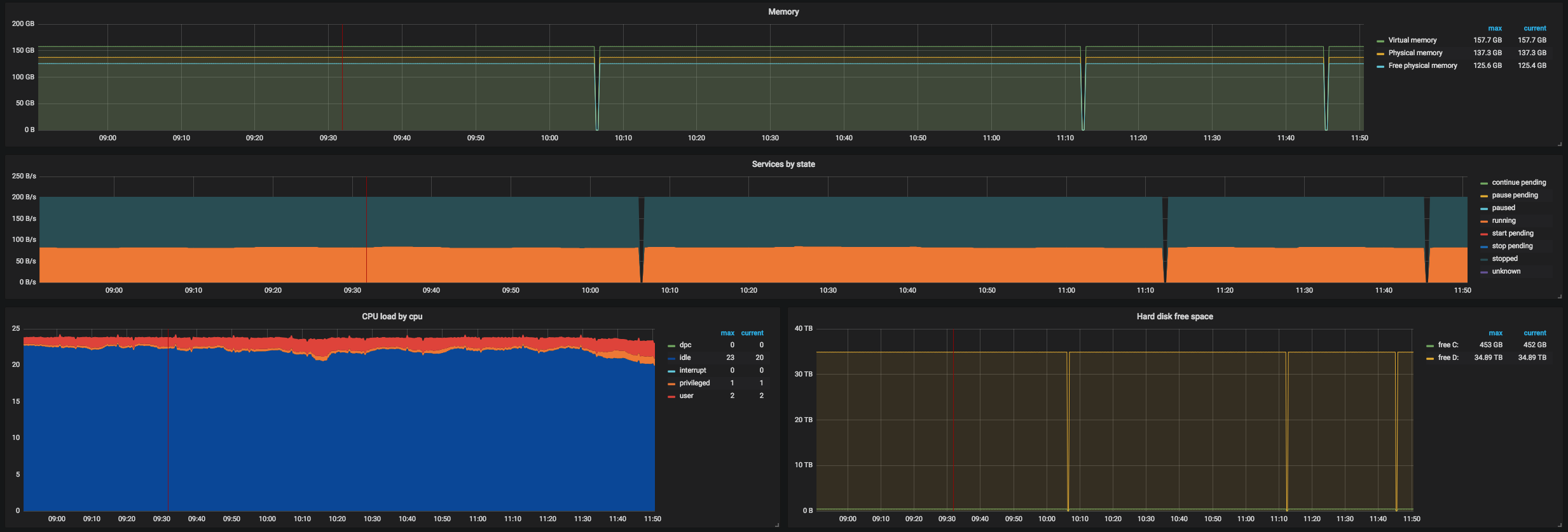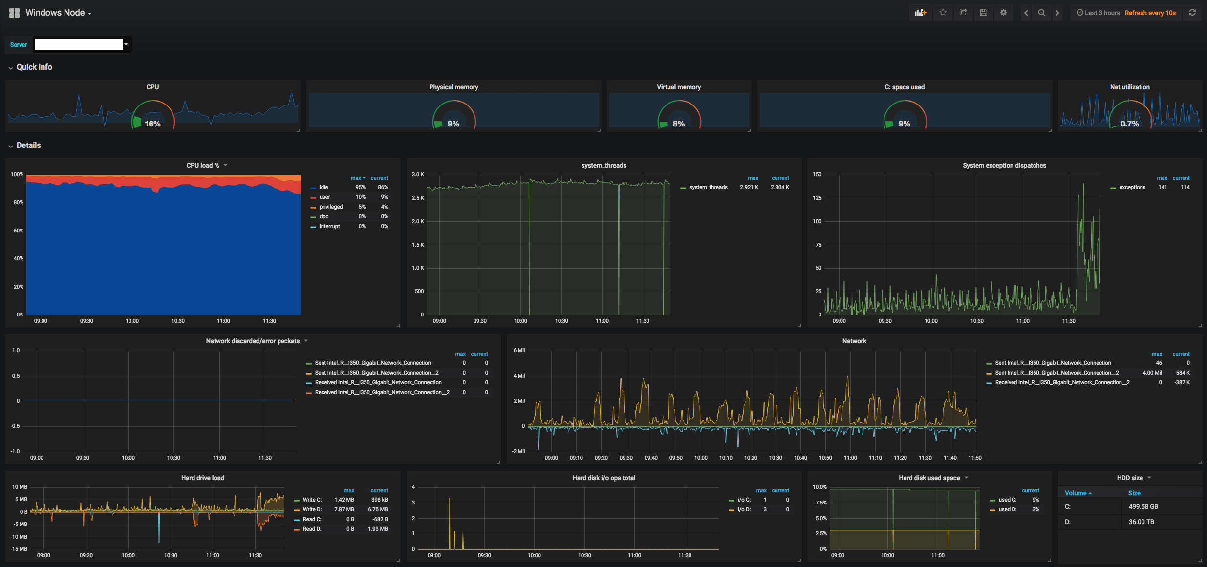 expansion on original (dashboards/2129) by ecto. Added quick panels for machine performance overview, new panels for hdd and cpu
