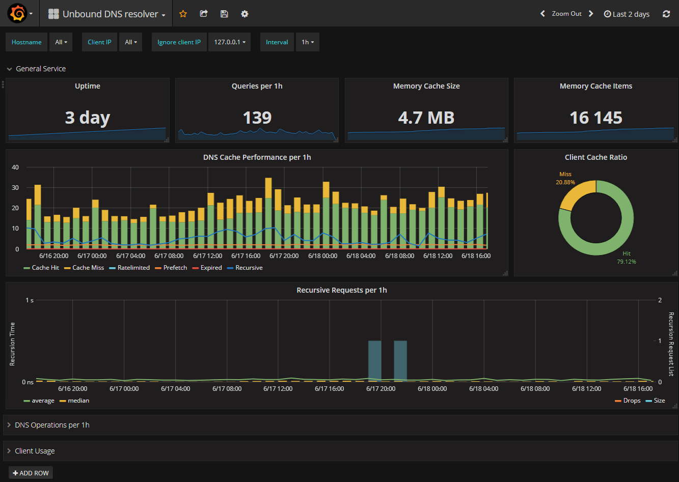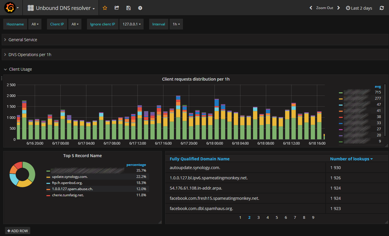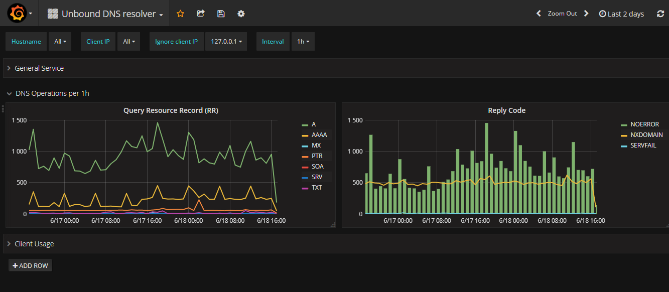 Displays statistics about uptime, cache ration, requests type and client usage. It uses both InfluxDB and Elasticsearch depending on the data it works on. All details are available here: http://www.tumfatig.net/20180618/monitoring-unbound8-using-net-snmp-telegraf-influxdb-and-elasticsearch/