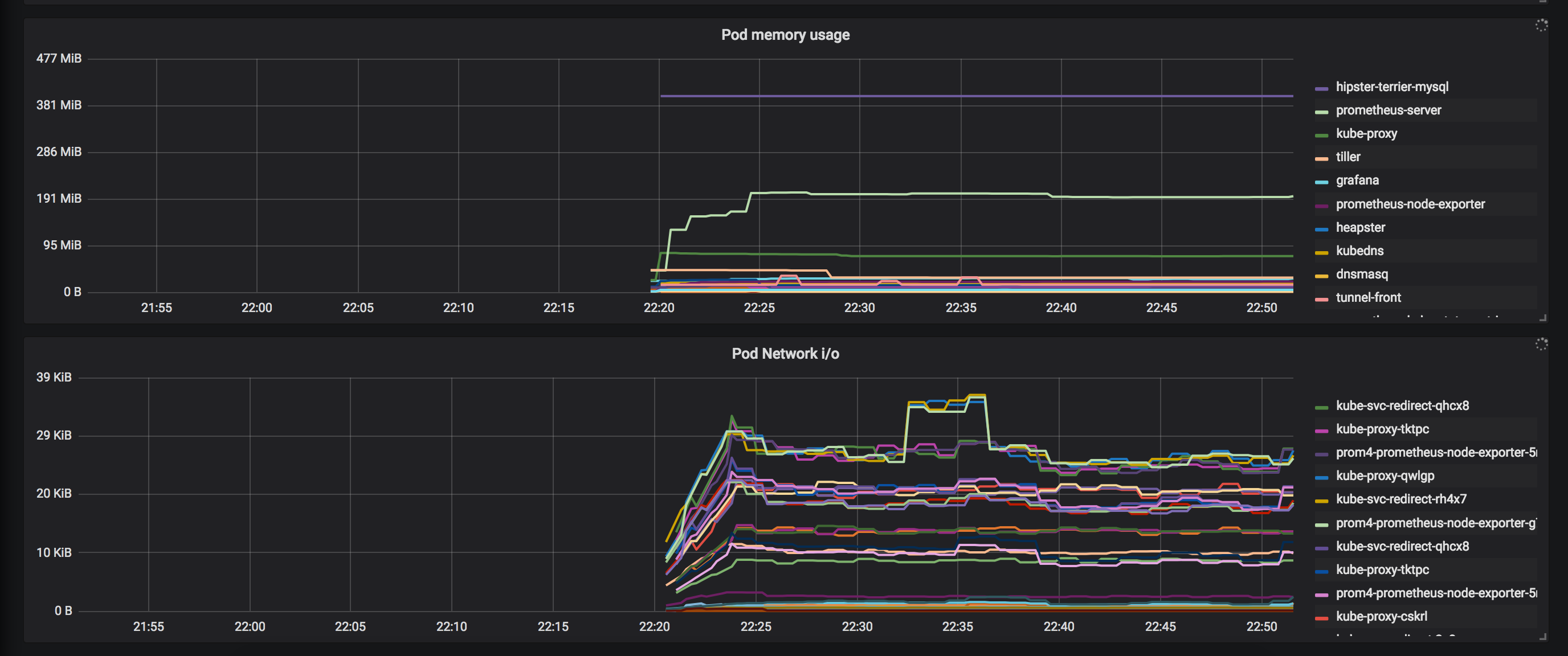 Monitor a Kubernetes cluster using Prometheus TSDB. Shows overall cluster CPU / Memory / Disk usage as well as individual pod statistics. Modified version of dashboard #162 to work with Prometheus 2.1+. Note - Managed Kubernetes instances (such as Azure AKS) might not give you access to FS stats, as you can see in the screenshot. You should be able to see those stats otherwise.