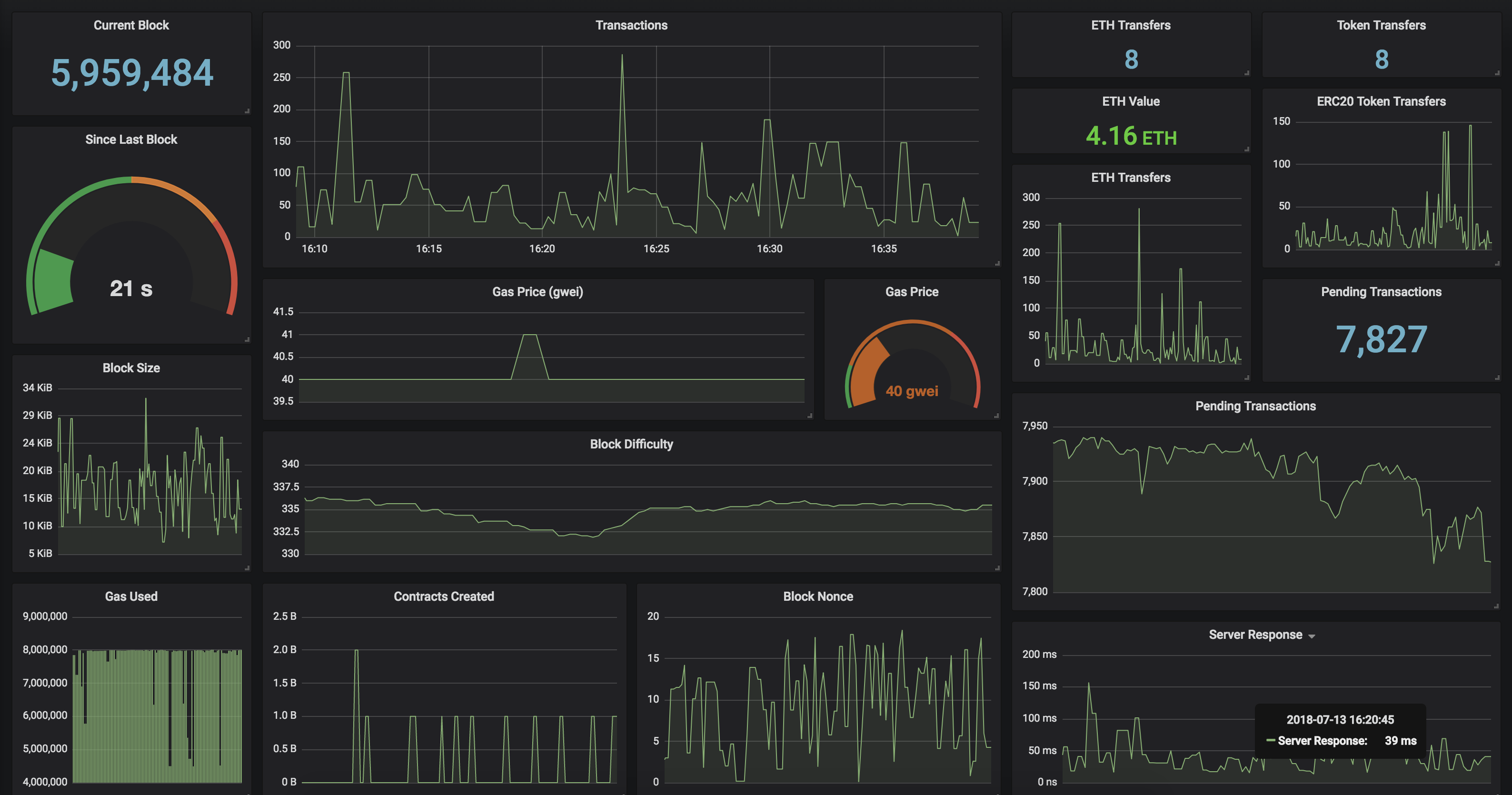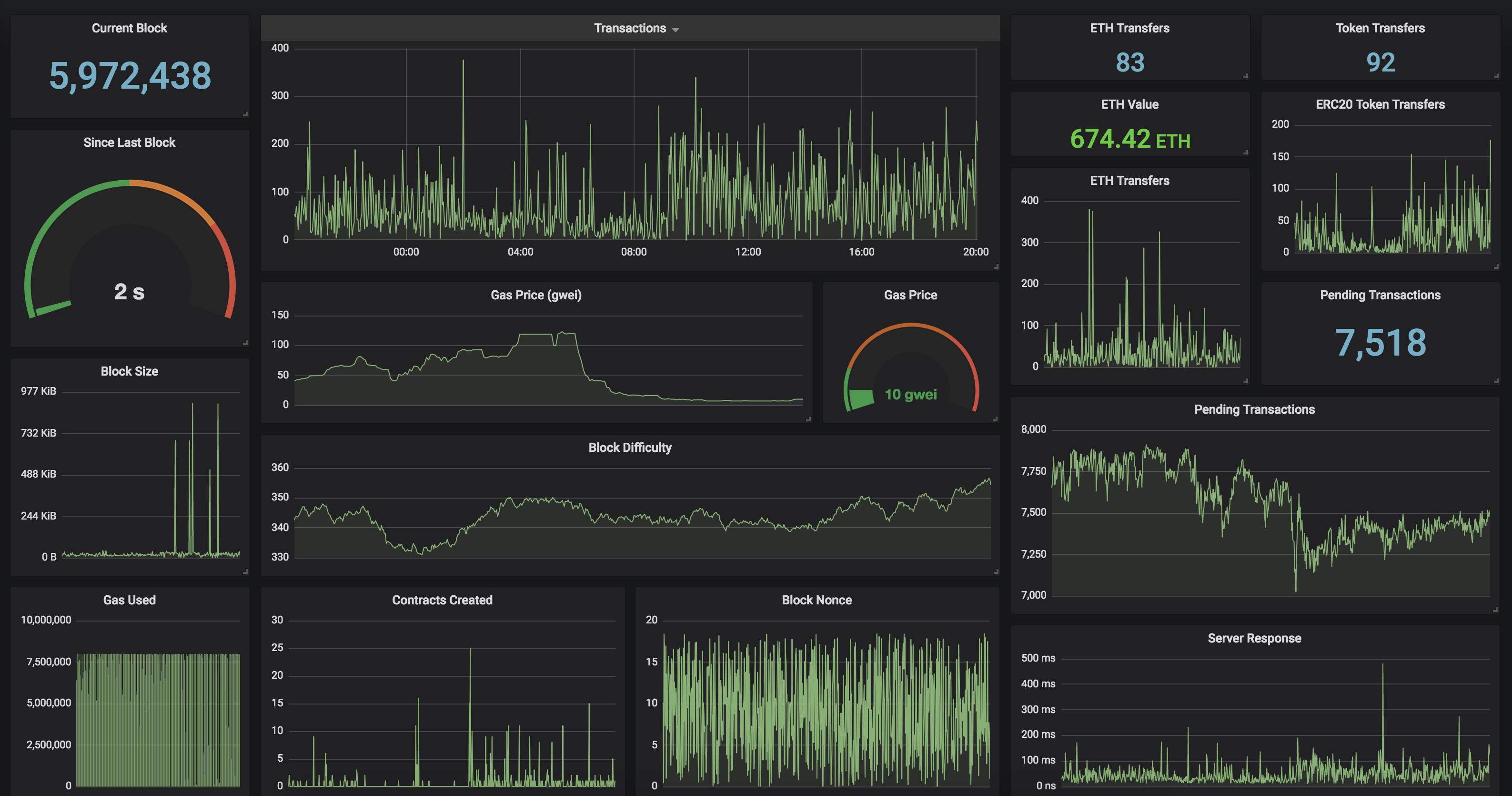 Monitor your Ethereum server and view detailed information on the current status of the blockchain. This Grafana Dashboard requires you to have a running instance of GethExporter which can be ran in a Docker container.