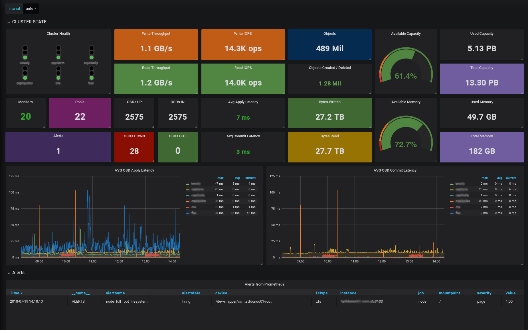This dashboard is targeted for service managers or teams which manage more than one ceph instances. It shows all the stats combined and also is possible to create comparison graphs between clusters. This dashboard uses native ceph prometheus module (ceph_exporter not needed) for ceph stats and node exporter for node stats
