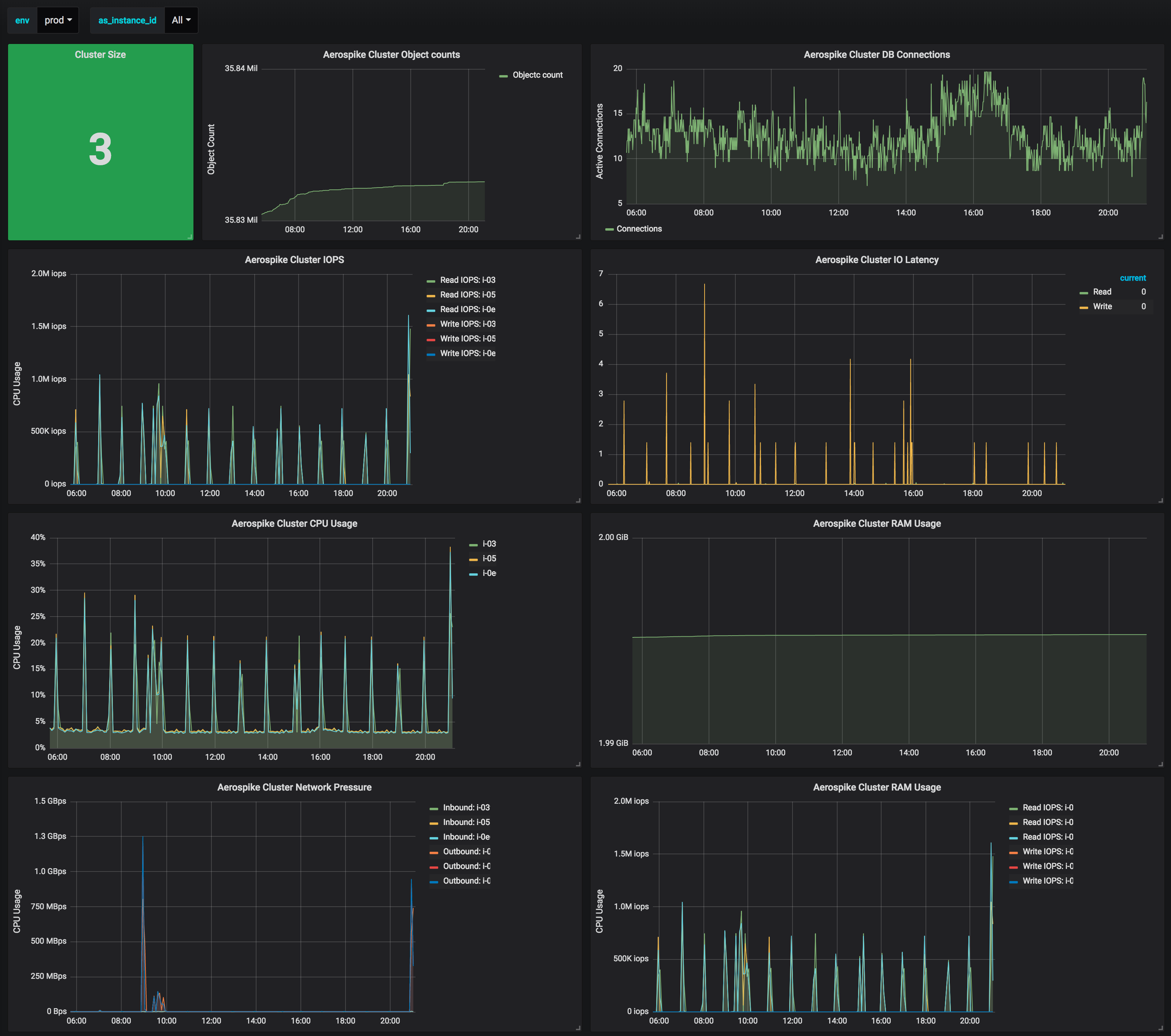 The Aerospike dashboard uses the cloudwatch and prometheus data sources to create a Grafana dashboard with the graph and singlestat panels.