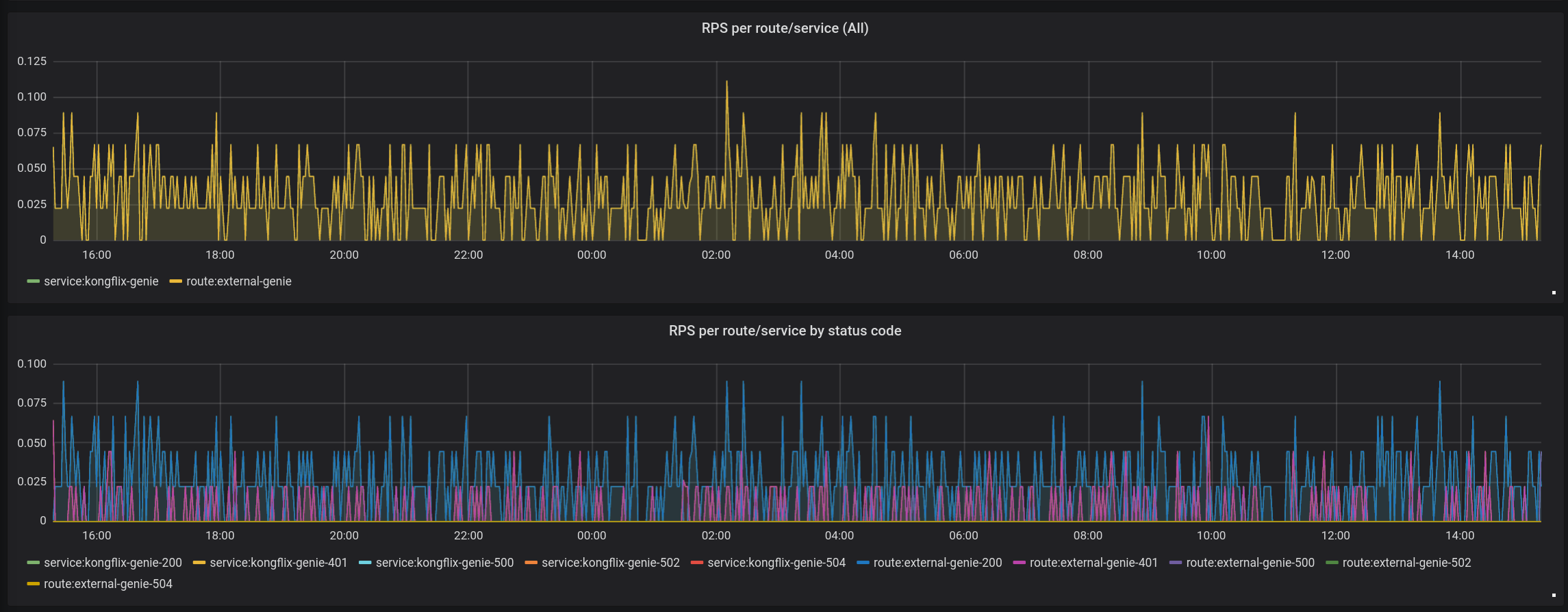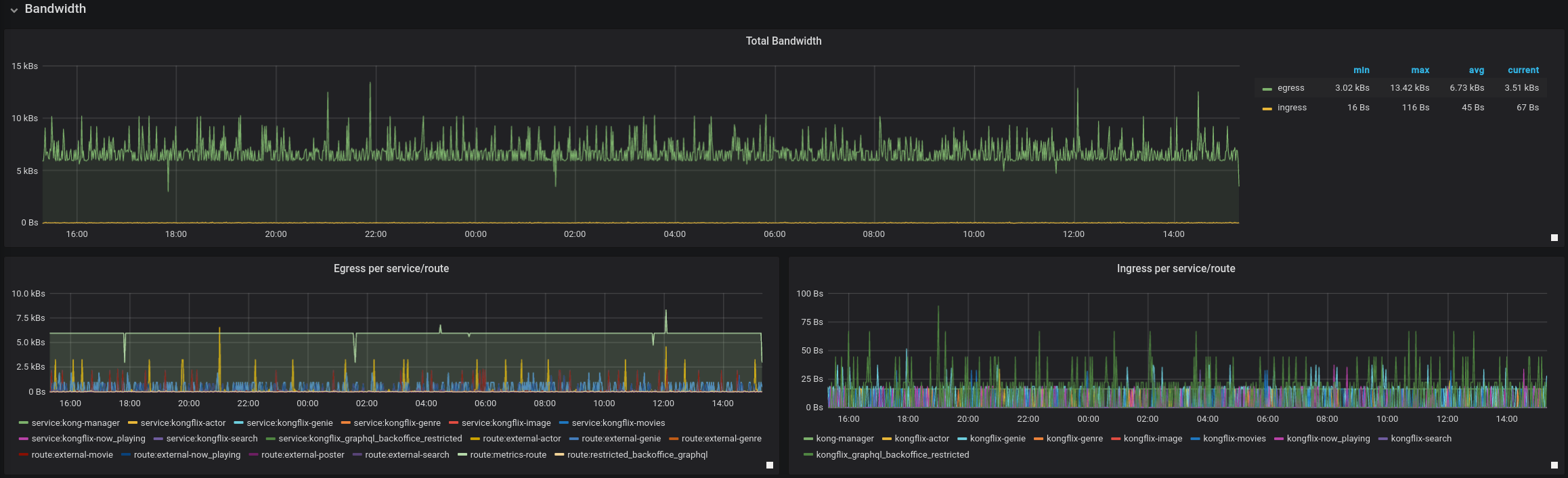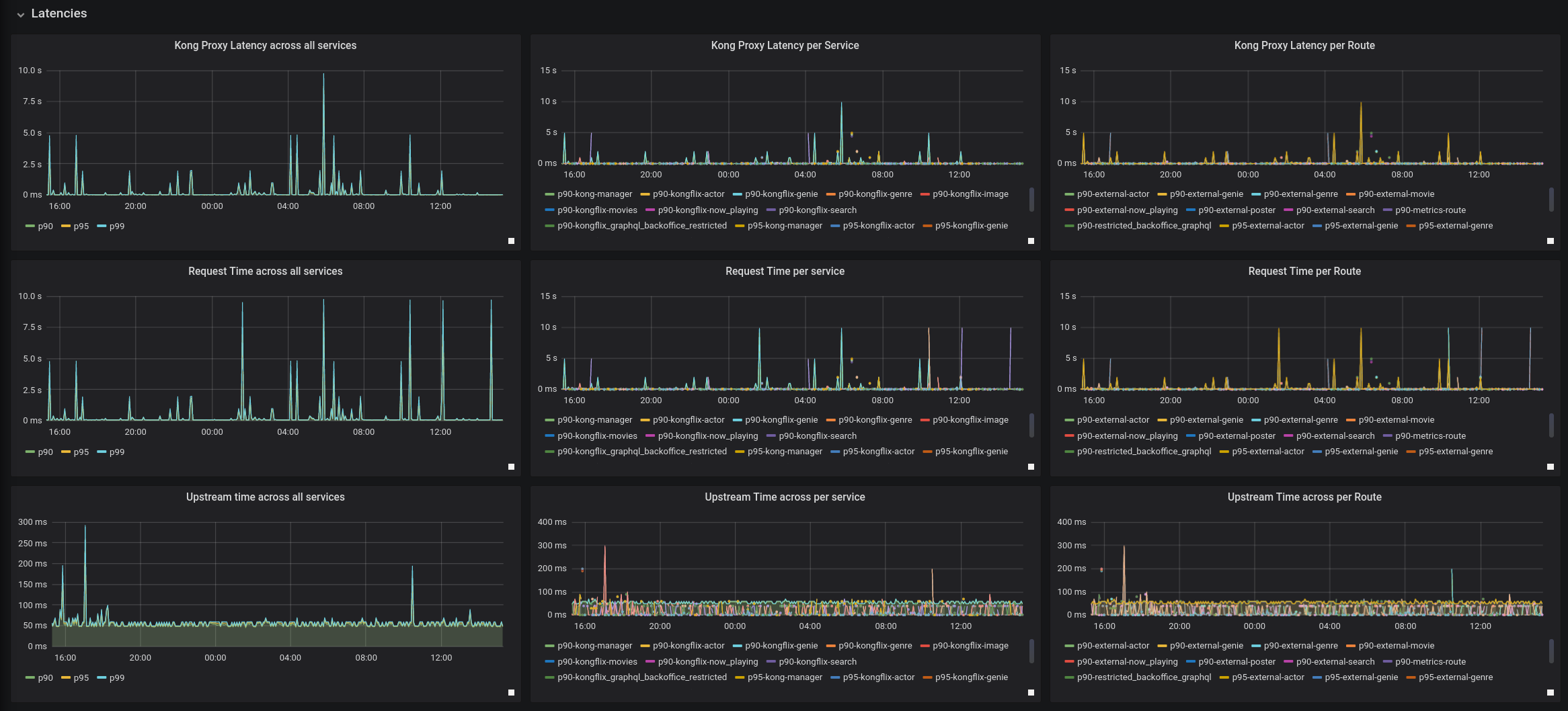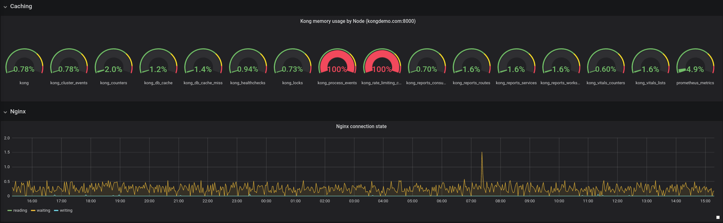Dashboard that graphs metrics exported via Prometheus plugin in Kong (http://github.com/kong/kong)