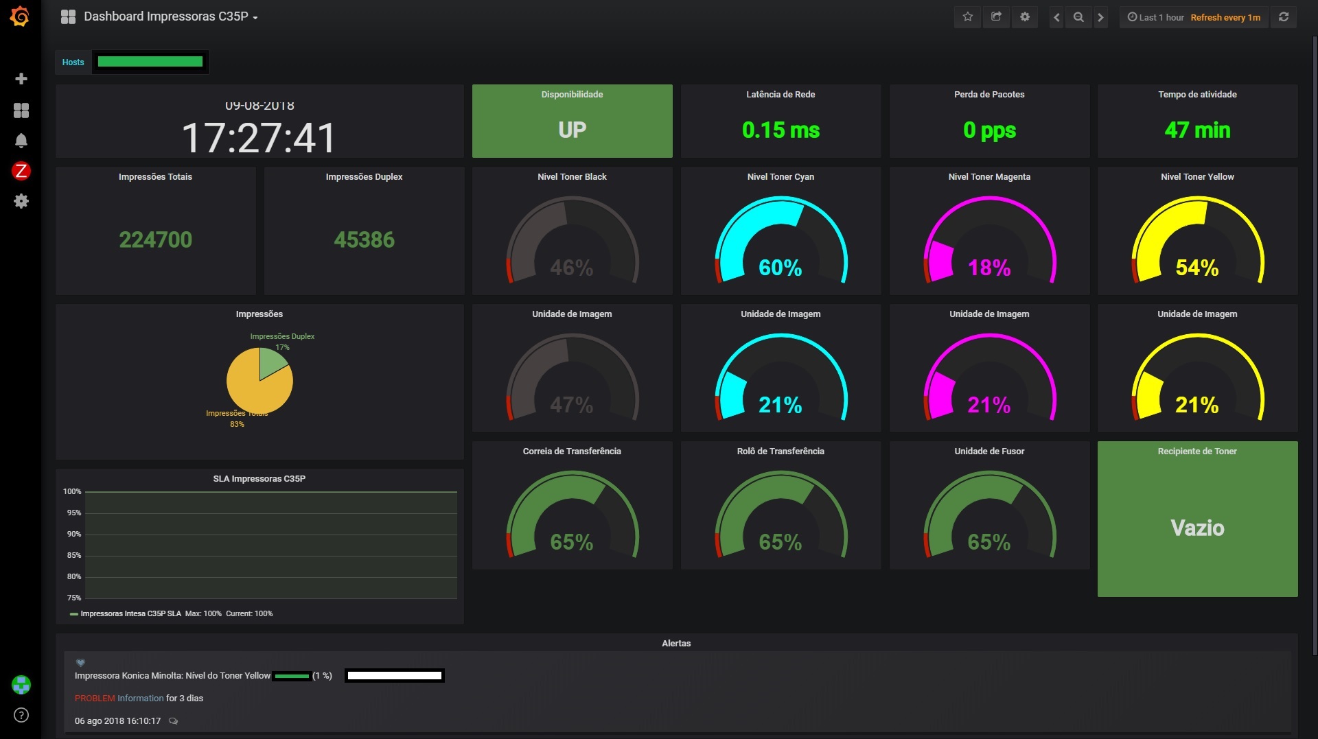 The Dashboard Impressoras C35P dashboard uses the alexanderzobnin-zabbix-datasource data source to create a Grafana dashboard with the alexanderzobnin-zabbix-triggers-panel, grafana-clock-panel, grafana-piechart-panel, graph and singlestat panels.