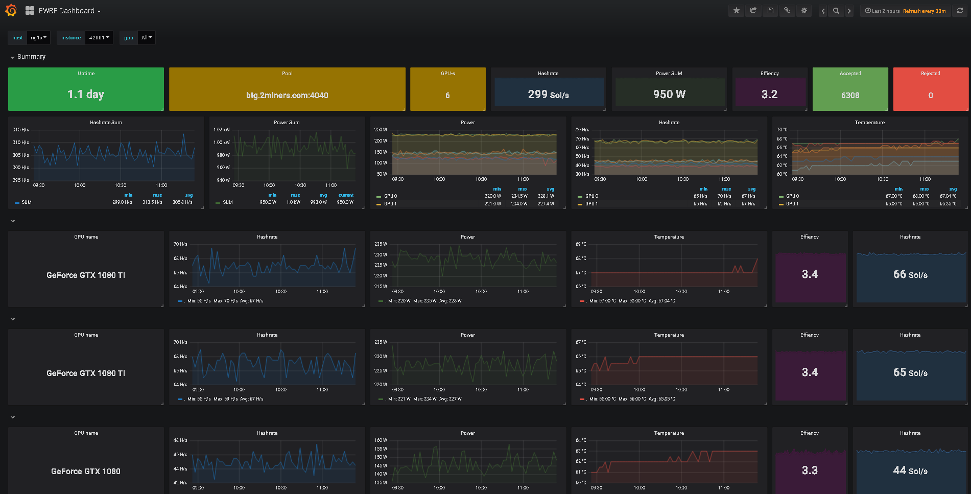 This dashboard is to be used with ewbf-collect InfluxDB collector, ewbf-collect is an open-source and cross-platform Node.js library used to record metrics within a ewbf's cuda miner application. The main github repo - https://github.com/miningtools/ewbf-collect