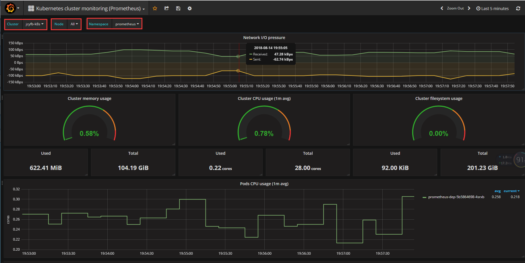 首先,这是一个kubernetes非常全面的监控面板;其次增加了几个选项:"Cluster"、“Node”、"Namespace",并且 Node 和 Namespace 会随Cluster联动。