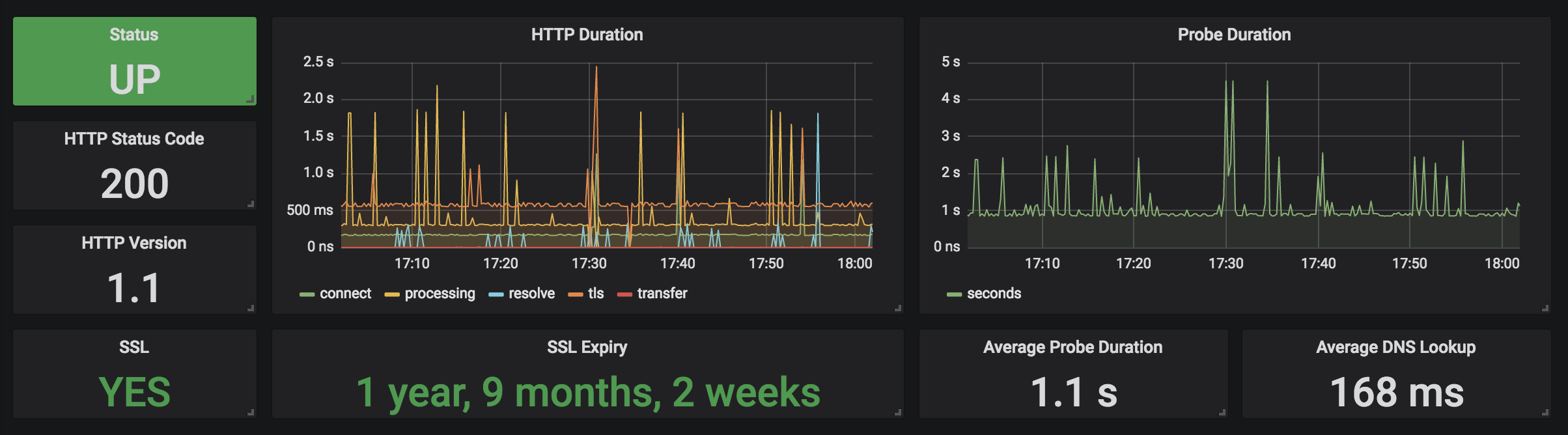 The Prometheus Blackbox Exporter dashboard uses the prometheus data source to create a Grafana dashboard with the graph and singlestat panels.