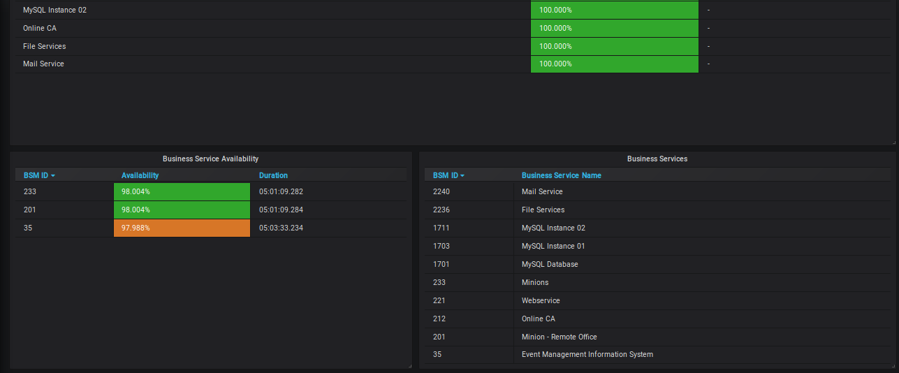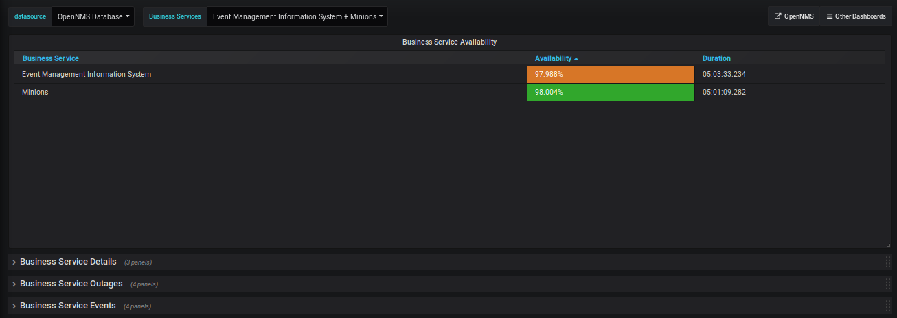 This dashboard displays the availability of Business Services from OpenNMS. It is based on the Business Service events stored in OpenNMS's PostgresSQL database. It includes a basic drill down for that.