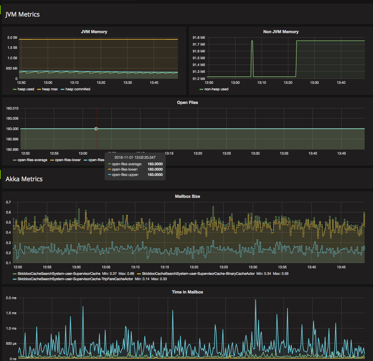 The Kamon IO dashboard uses the influxdb data source to create a Grafana dashboard with the graph and text panels.