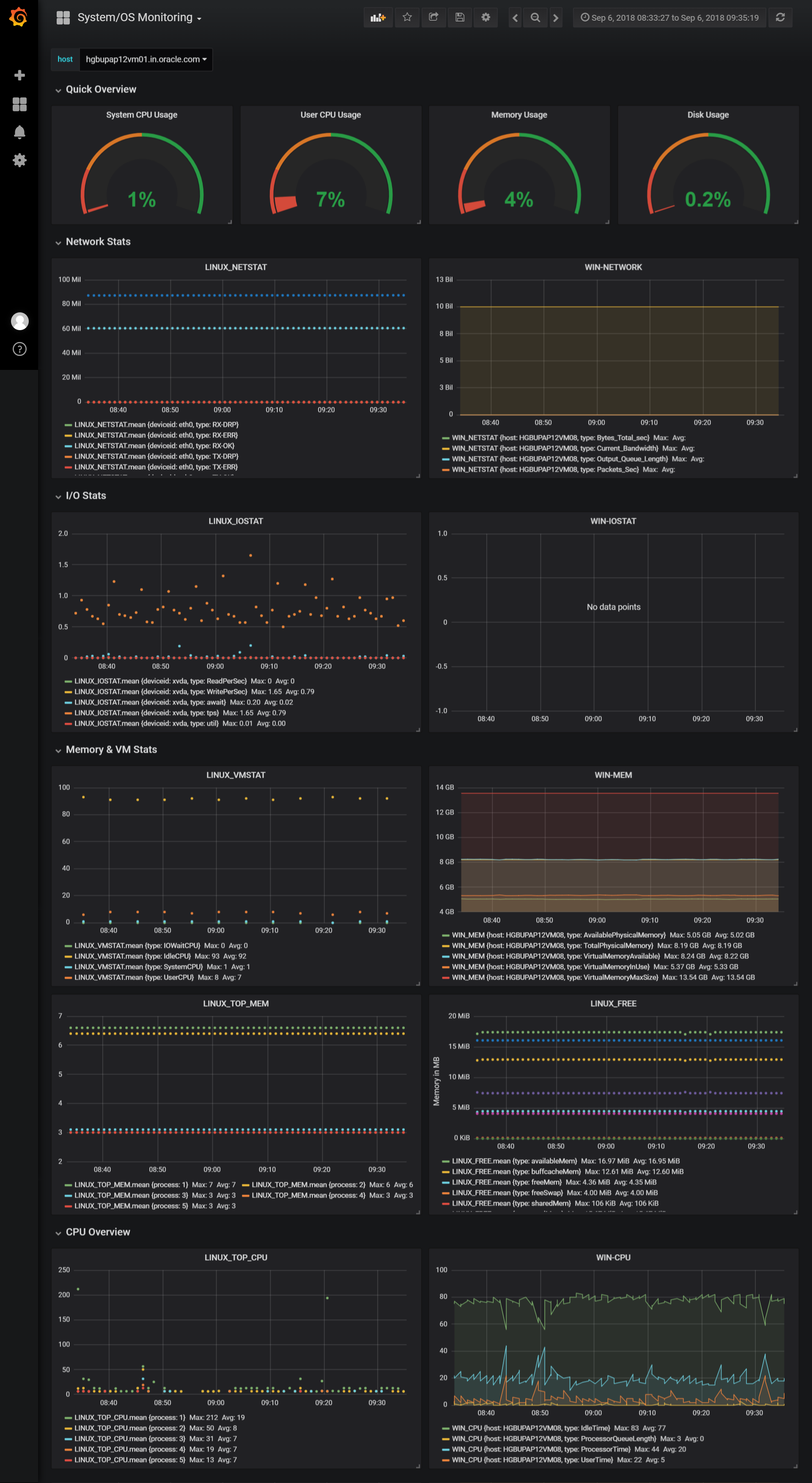 This Dashboard displays all the Linux & Windows Operating System Statistics Like IOSTAT, NETWORK Stat, Memory Usage, CPU Load, Disk Usage etc.