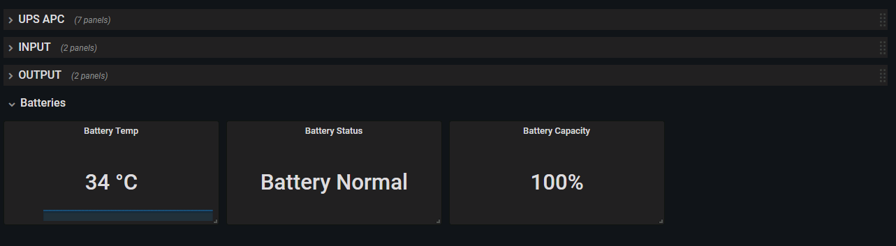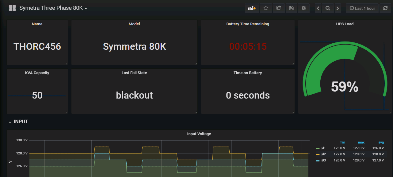 The UPS Symetra Three Phase 80K dashboard uses the influxdb data source to create a Grafana dashboard with the graph and singlestat panels.
