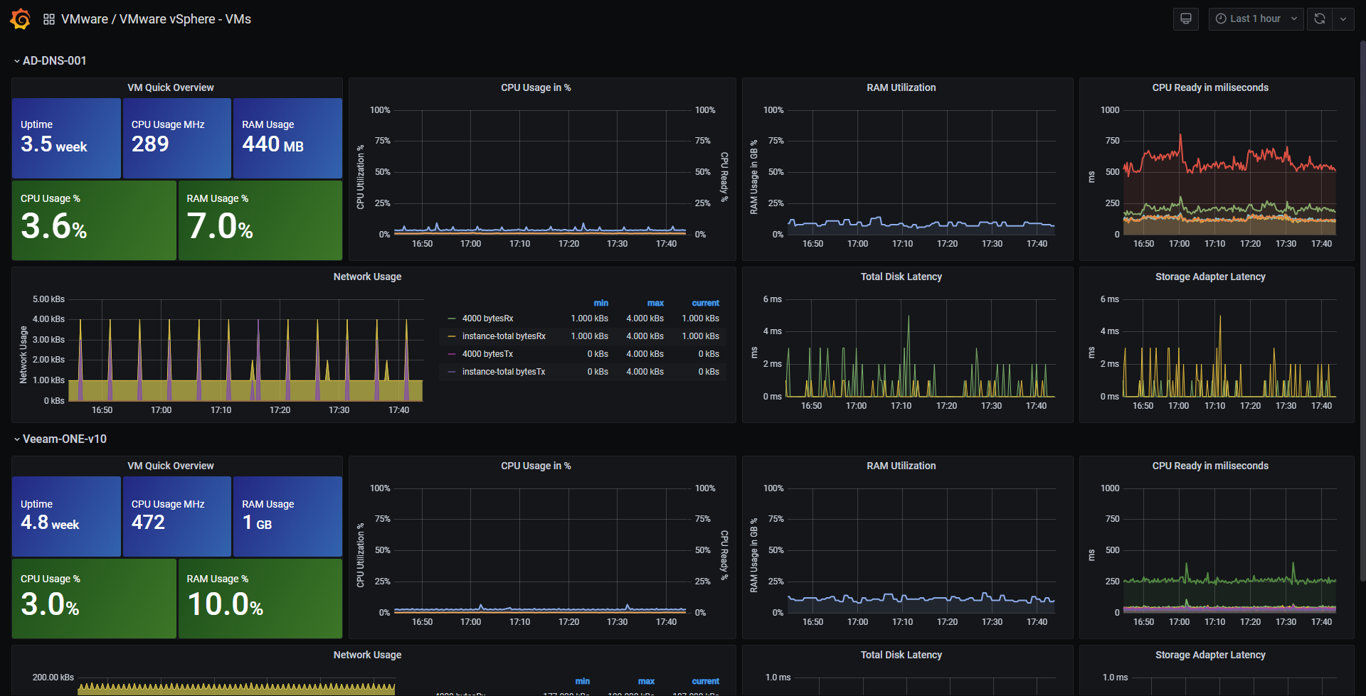 This dashboard contains two different sections, one to monitor the ESXi and vCenter Performance, and another one for Virtual Machines Performance. The Dashboard has variables to make it easier to use, and more suitable for all different workloads out there. The gauges are configured automatically as well to the Datastores you select, in case you have so many, consider changing the Min Width on the Repeat Panel.