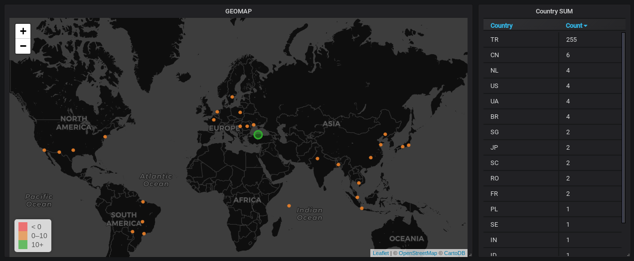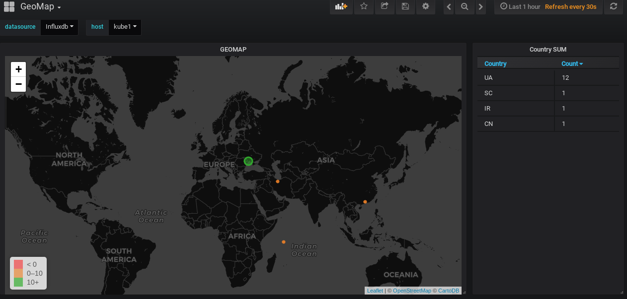 There is an easy dashboard for showing statistic about the GEO IPs information from Nginx web server log. This dashboard use the InfluxDB database and small Python script that I wrote for parsing Nginx logs.