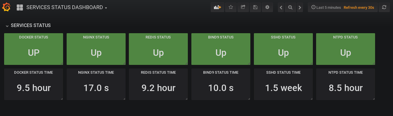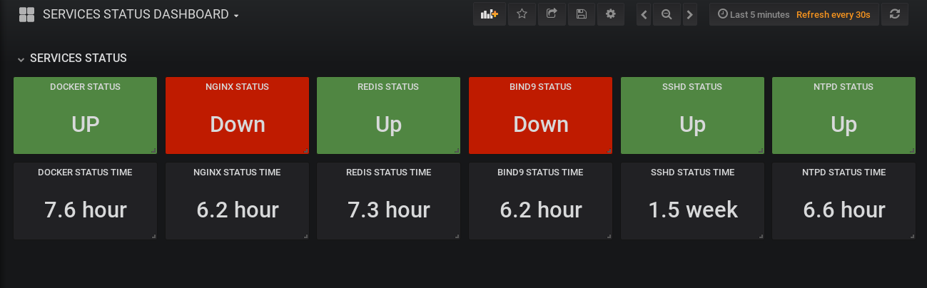 This dashboard was created for the python script that checks a SystemD services status, this script runned by Telegraf exec plugin, for all additional information please go to the project GitHub page: