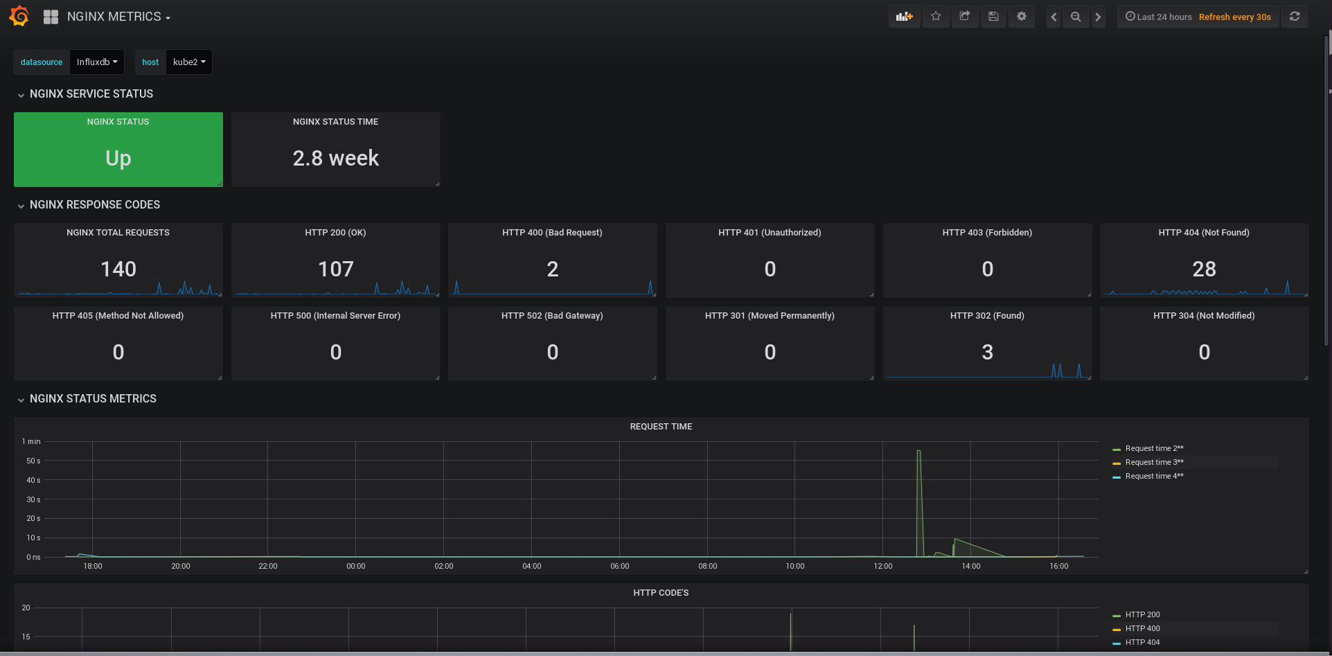 All needed information about how make configuration of Nginx and Telegraf for this dashboard, you can get from my article: