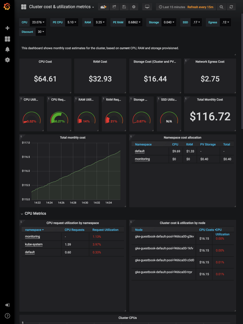 A dashboard to track cluster costs (based on configurable cost variables) and cluster utilization metrics. Costs for CPU, compute, storage, and network resources are included.