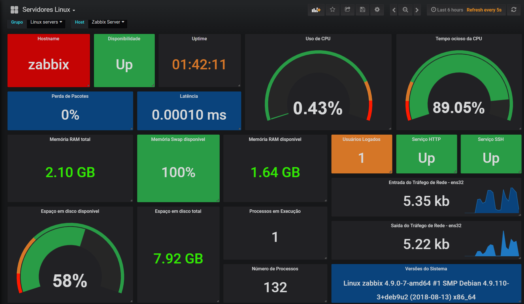 Dashboard based on information collected from Zabbix Server for Linux environment. In this panel you can select a group and then the specific host from which we want to view the collected data.