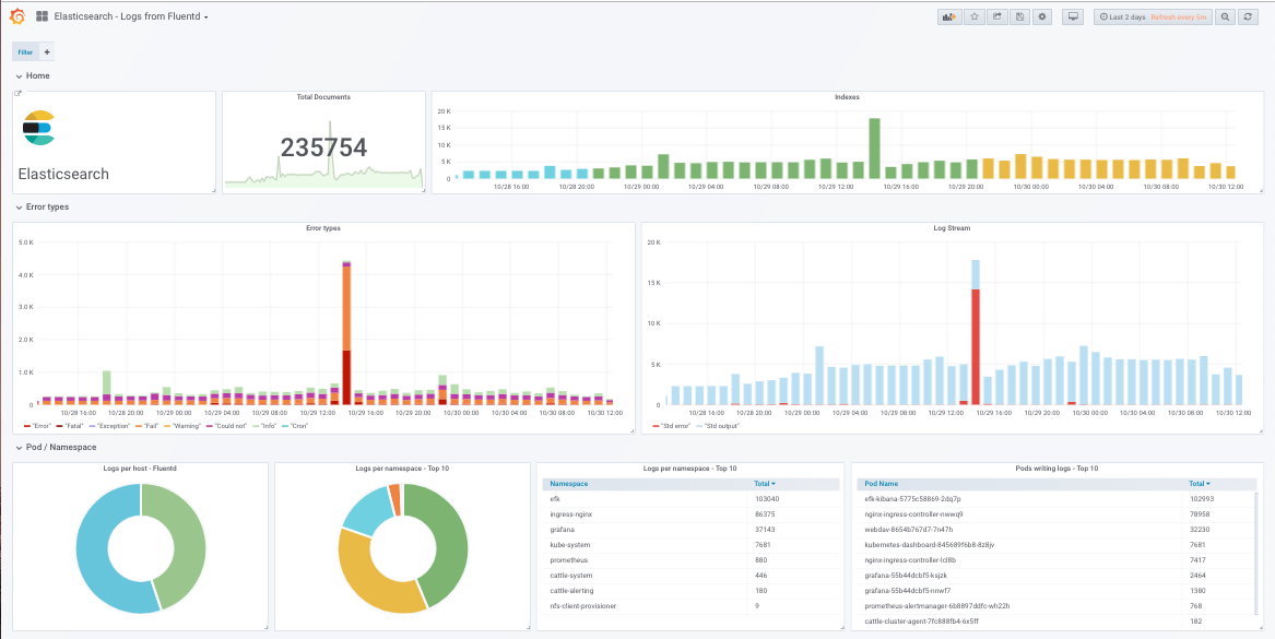 Some basic statistics and message distribution across pods and namespaces logs collected by Fluentd and sent to Elasticsearch. Can be also used for other sources