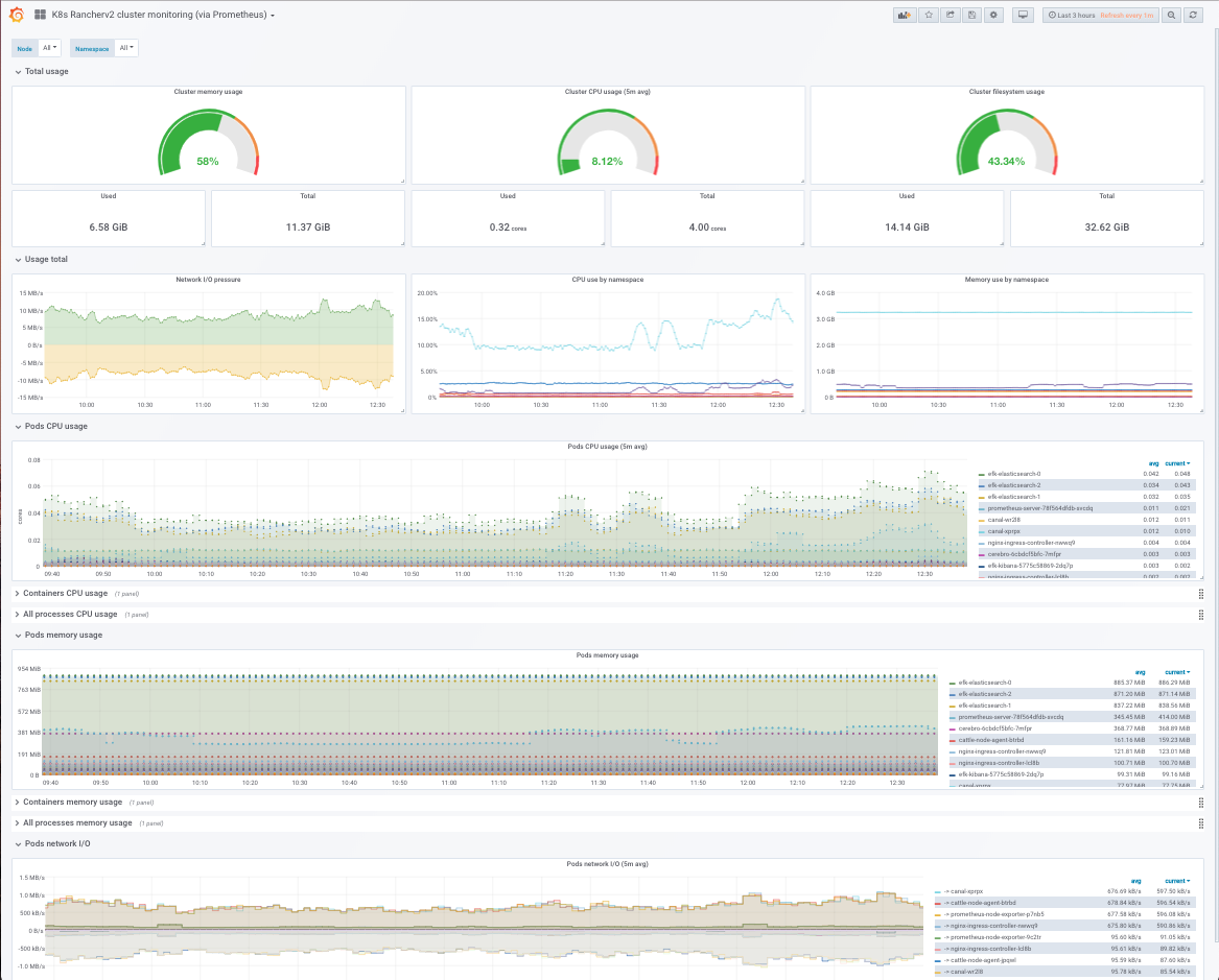 Monitors K8s Rancherv2 cluster using Prometheus. Shows overall cluster CPU / Memory / Filesystem usage as well as individual pod, containers, systemd services statistics. Uses cAdvisor metrics only.