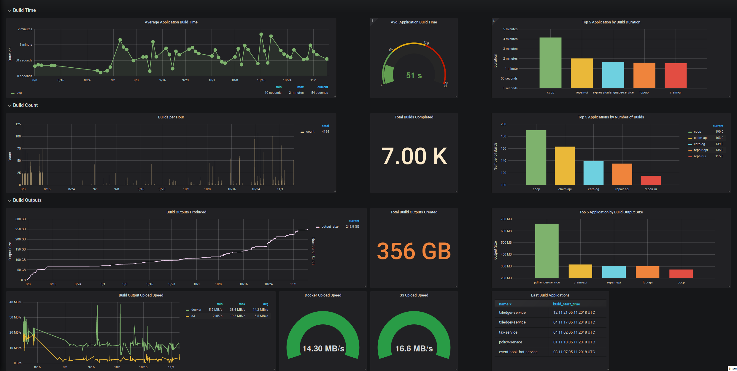 The dashboard visualizes build statistics from baur (https://github.com/simplesurance/baur). The baur PostgreSQL database has to be added as Graphana Datasource to make it available to the dashboard.