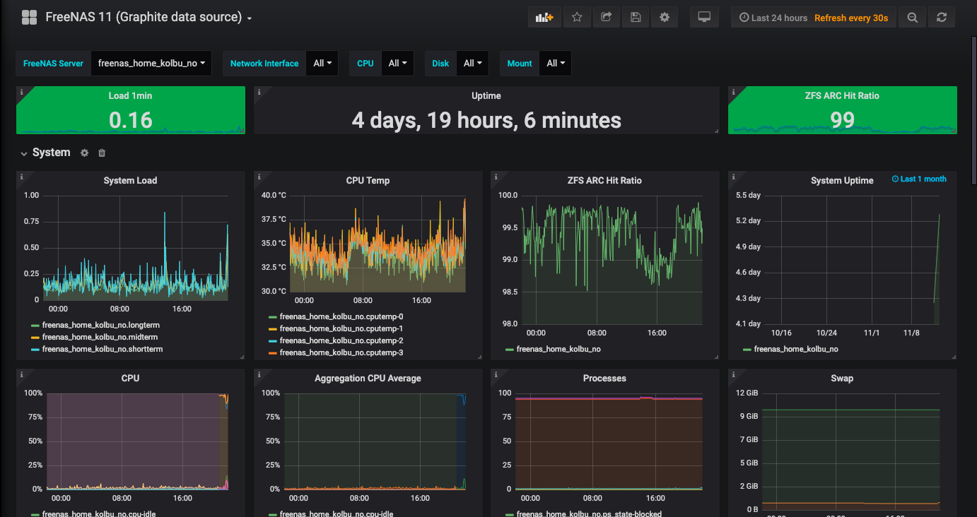 Dashboard for FreeNAS 11 using Graphite as the time series database. Dynamic auto-populated variables for CPUs, network interfaces, disks, etc so should hopefully be usable out of the box. Issues/pull requests on https://github.com/okolbu/grafana-dashboards, thanks.