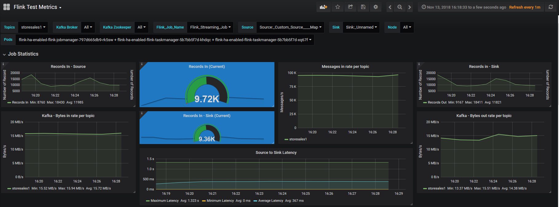Flink Metrics (with Kafka) on K8S This dashboard if for monitoring Flink Applications Performance. It includes metrics like record count, latency. It also has kafka parameters like bytes count. Moreover, it has k8s memory, CPU and Network statistics.