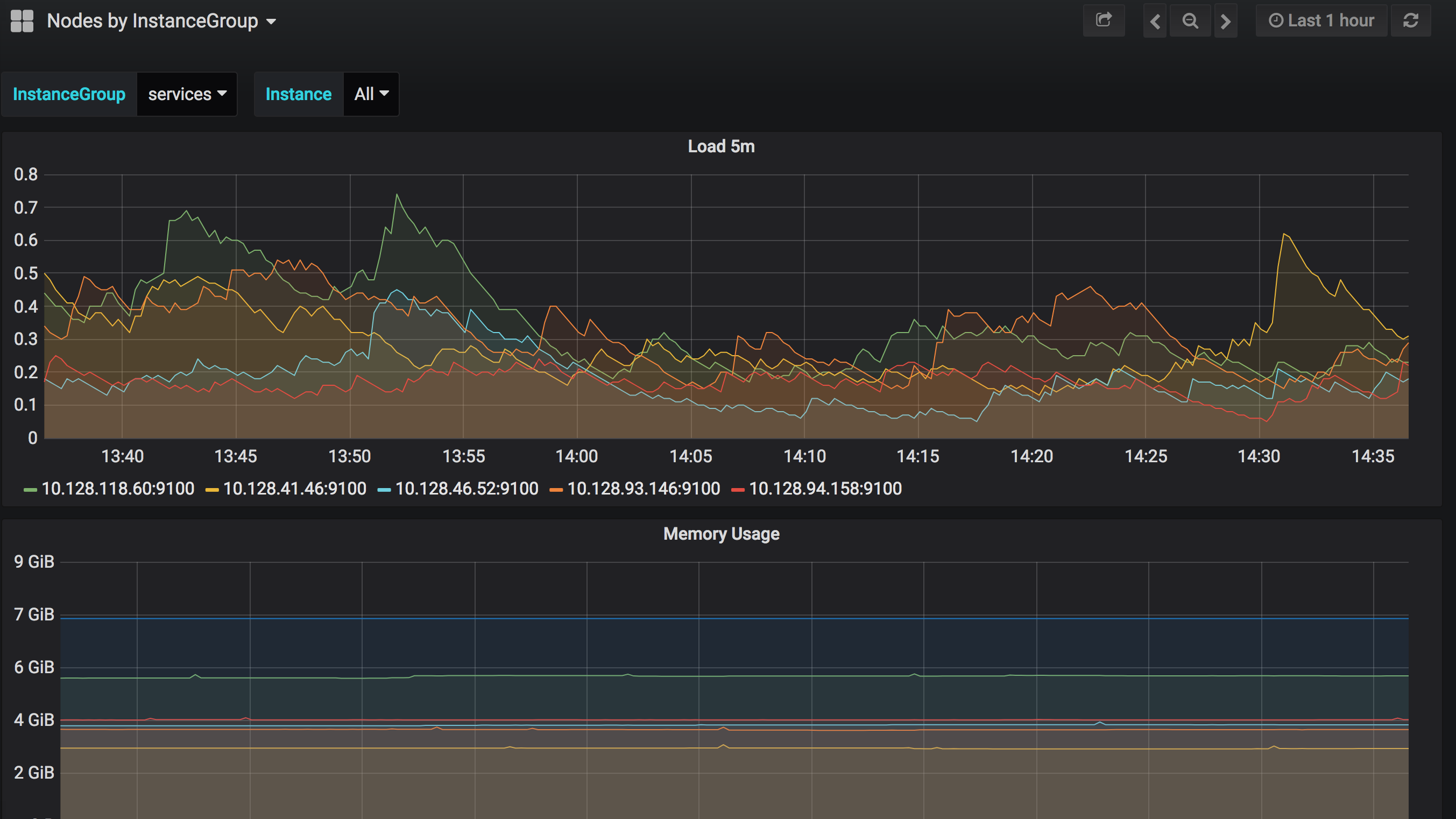 Graph Load and Memory usage of nodes grouped by instance-group. This is useful for planning the usage of your instance-groups.