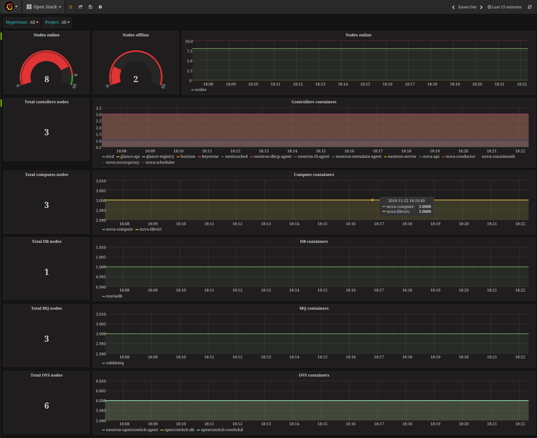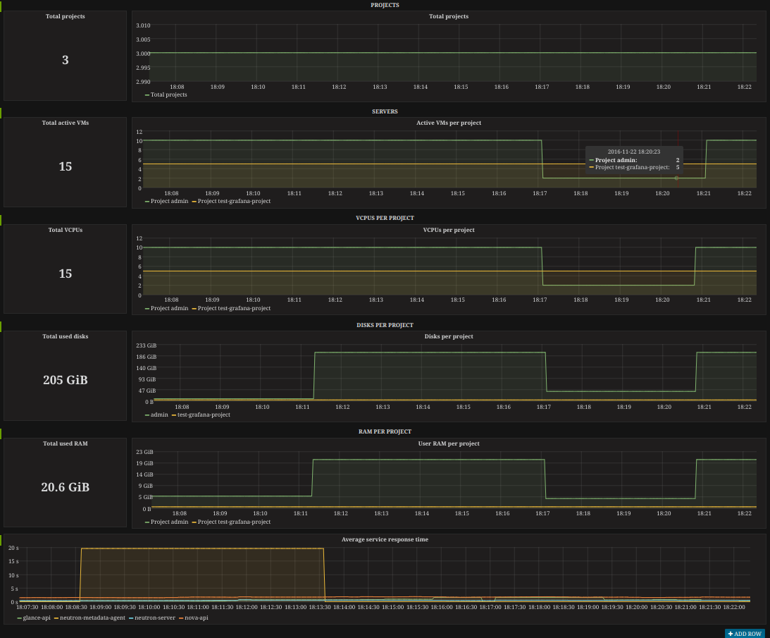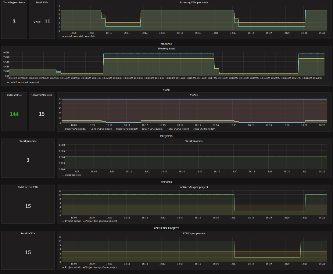 The Open Stack dashboard uses the prometheus data source to create a Grafana dashboard with the graph and singlestat panels.