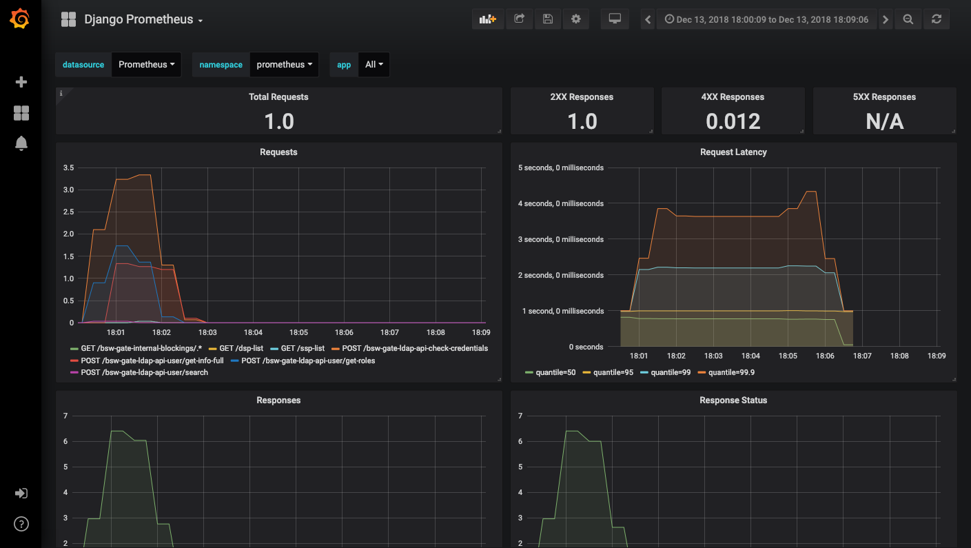 Django metrics dashboard using korfuri/django-prometheus Prometheus metrics exporter