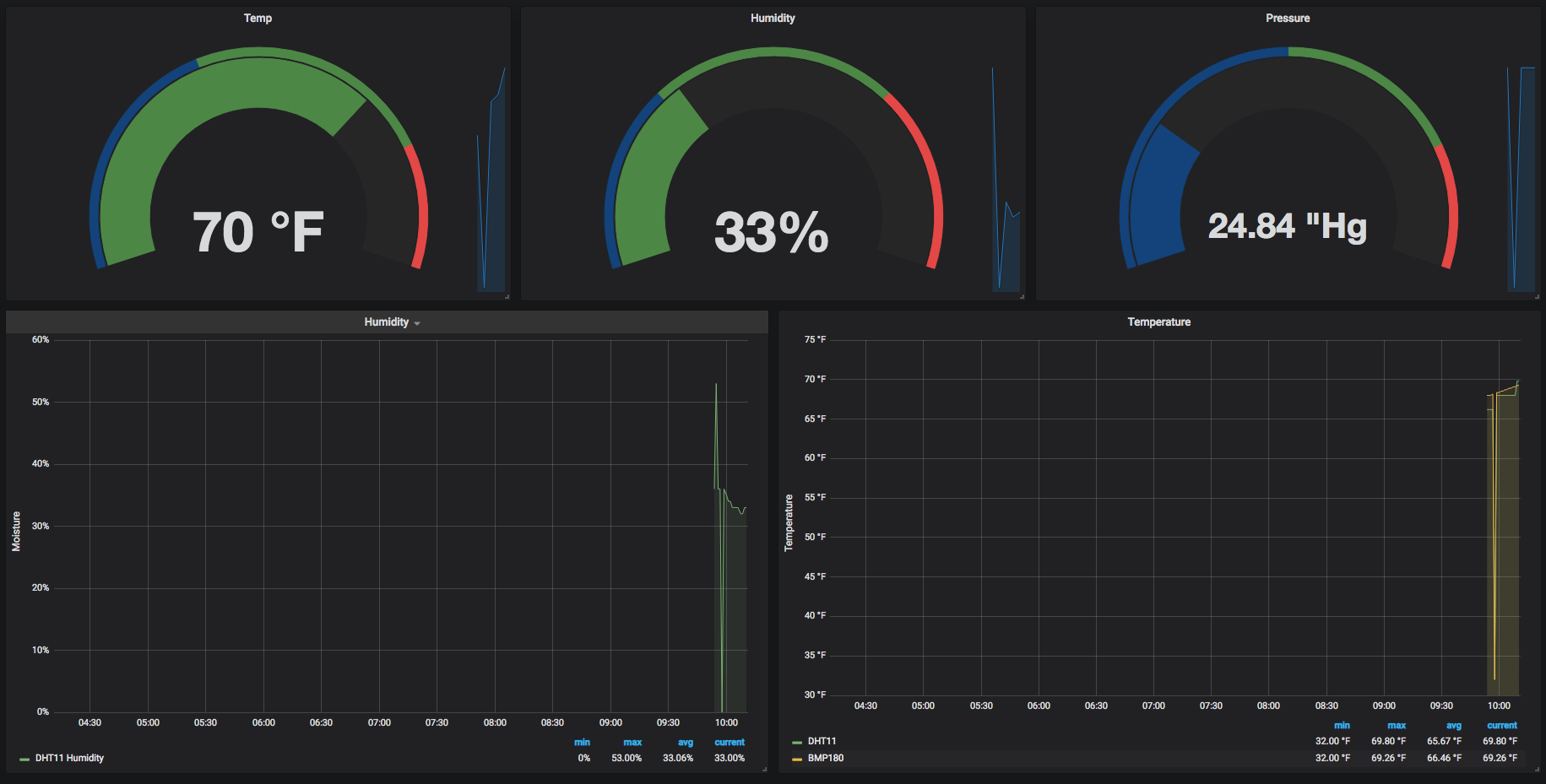 The dashboard shows the current air temperature, humidity and pressure from BrewBench monitor using DHT11 and BMP180 sensors. Useful to keep track of conditions in your brew house.