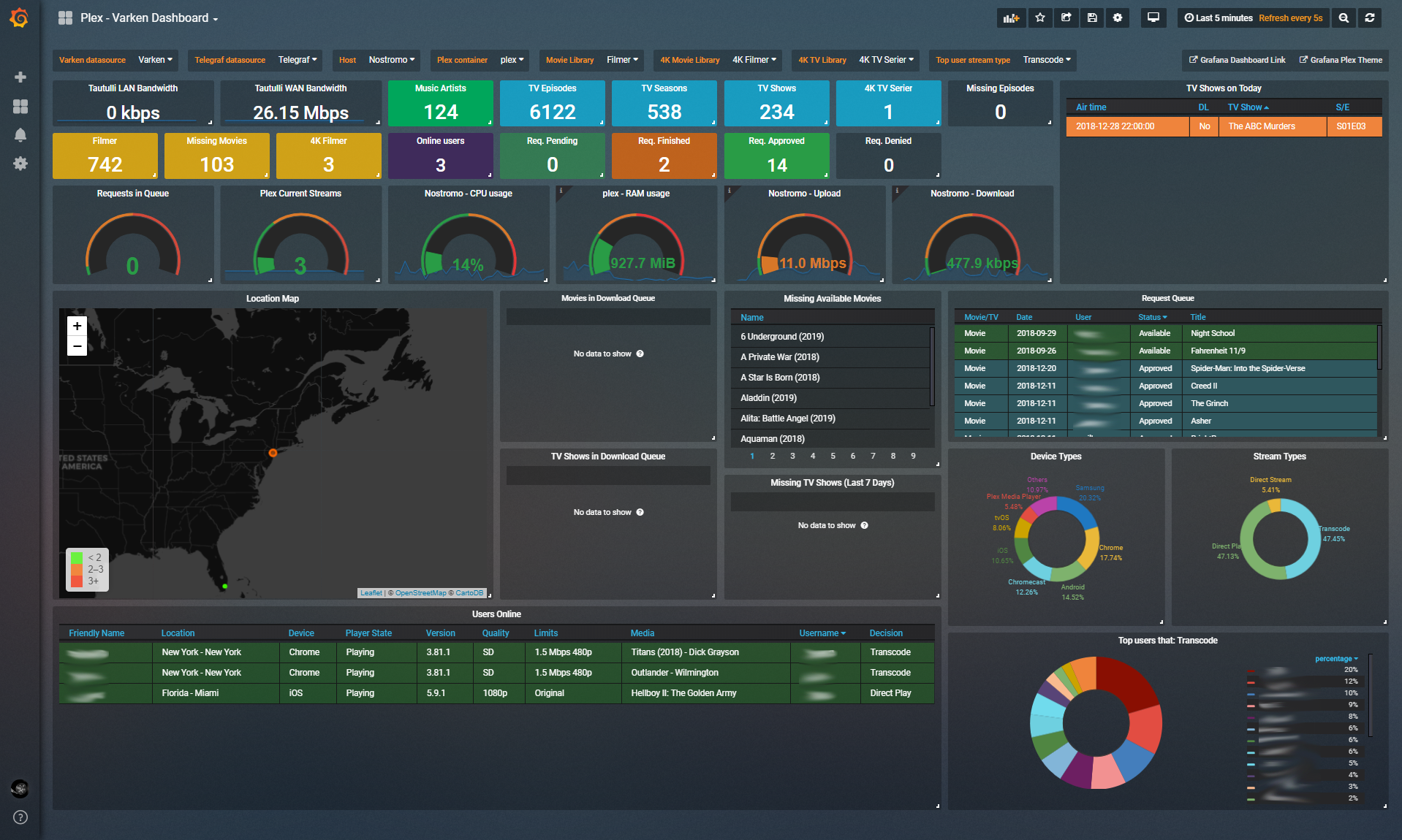 A Grafana dashboard for displaying Plex stats using the Varken and Telegraf docker containers.