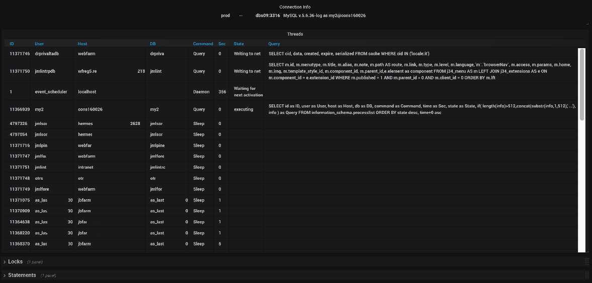Shows MySQL processlist and blocking locks info. This dashboard is connected with the 2MySQL Simple Dashboard. Both InnoDB and metadata blocking locks are displayed. To enable metadata lock info run: UPDATE setup_instruments SET ENABLED = 'YES' WHERE NAME = 'wait/lock/metadata/sql/mdl';