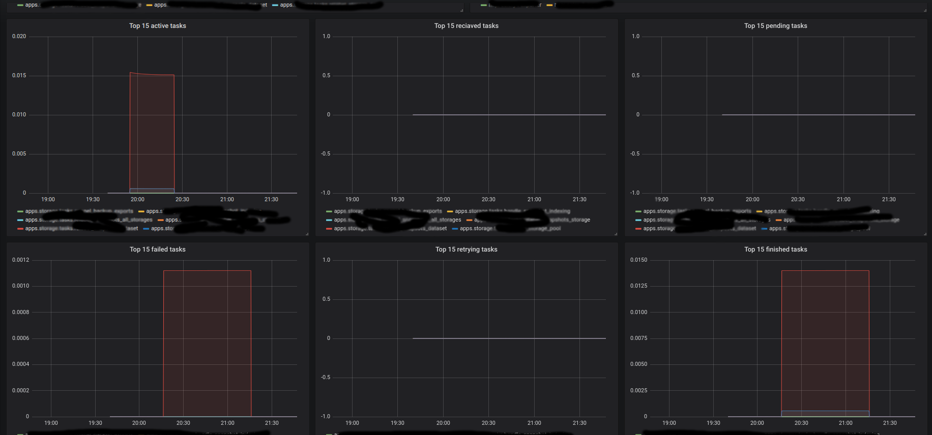 This Dashboard works with celery prom exporter from https://github.com/zerok/celery-prometheus-exporter However, I've adjusted exporter to work from Django config file I think it should not affect main logic.