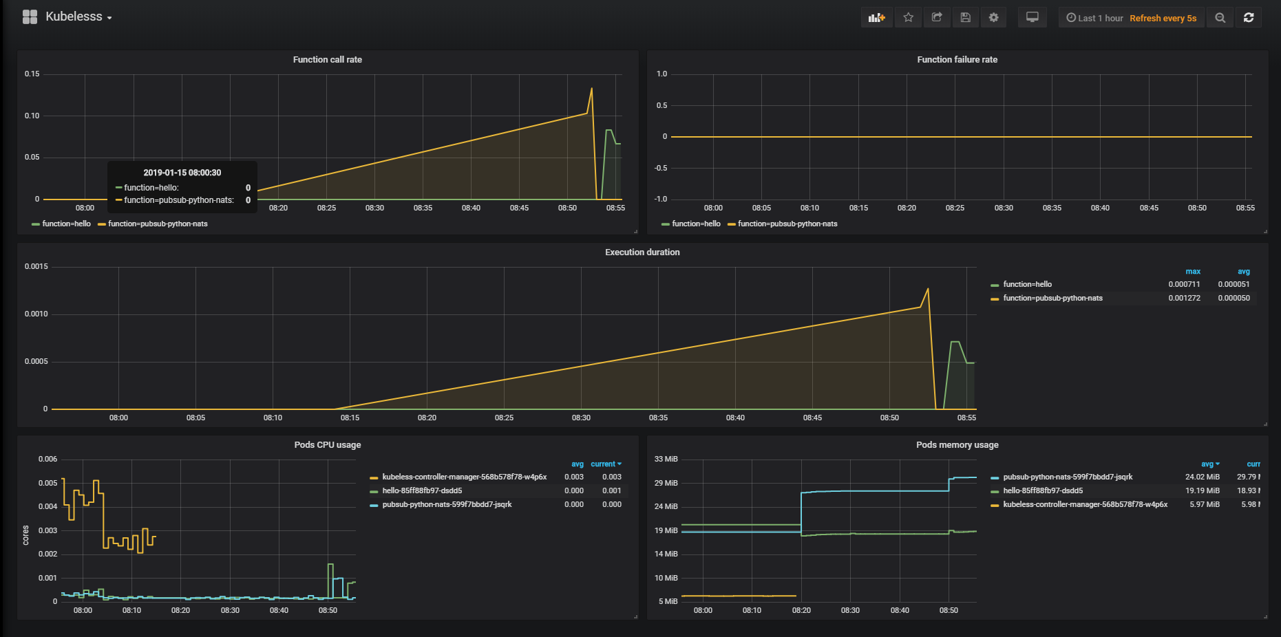 Dashboard for Kubeless monitoring via Prometheus, shows function calls, failure and duration as well as CPU and Memory usage for kubeless pods (Controller and runtimes)